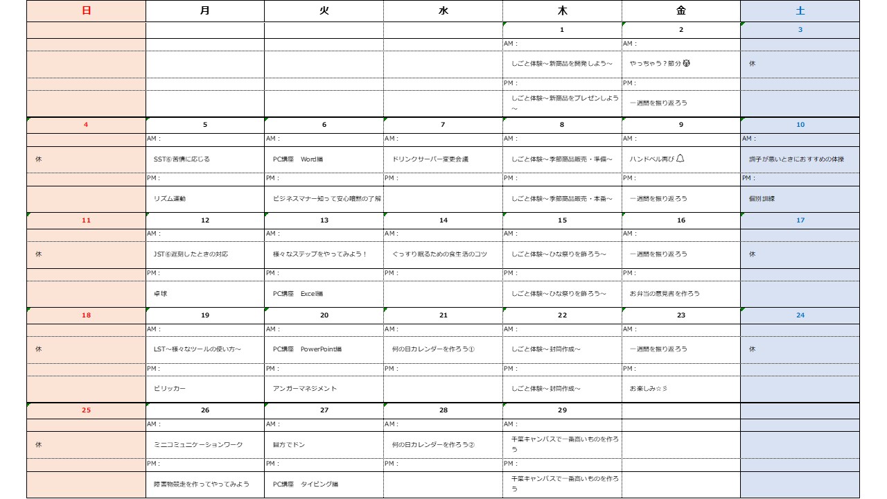 その他、定番としてSST、JST、LST、PC講座、しごと体験なども用意があります。