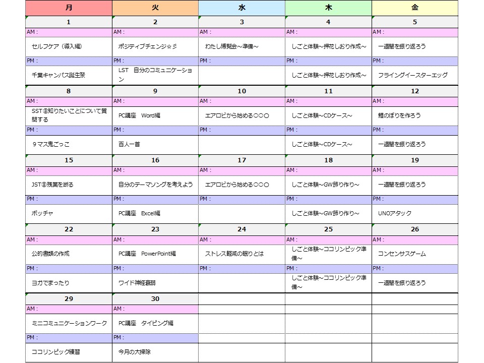 4月プログラムの中にみられる「わたし博覧会」「ココリンピック」は千葉キャンパス定番行事となっています。
