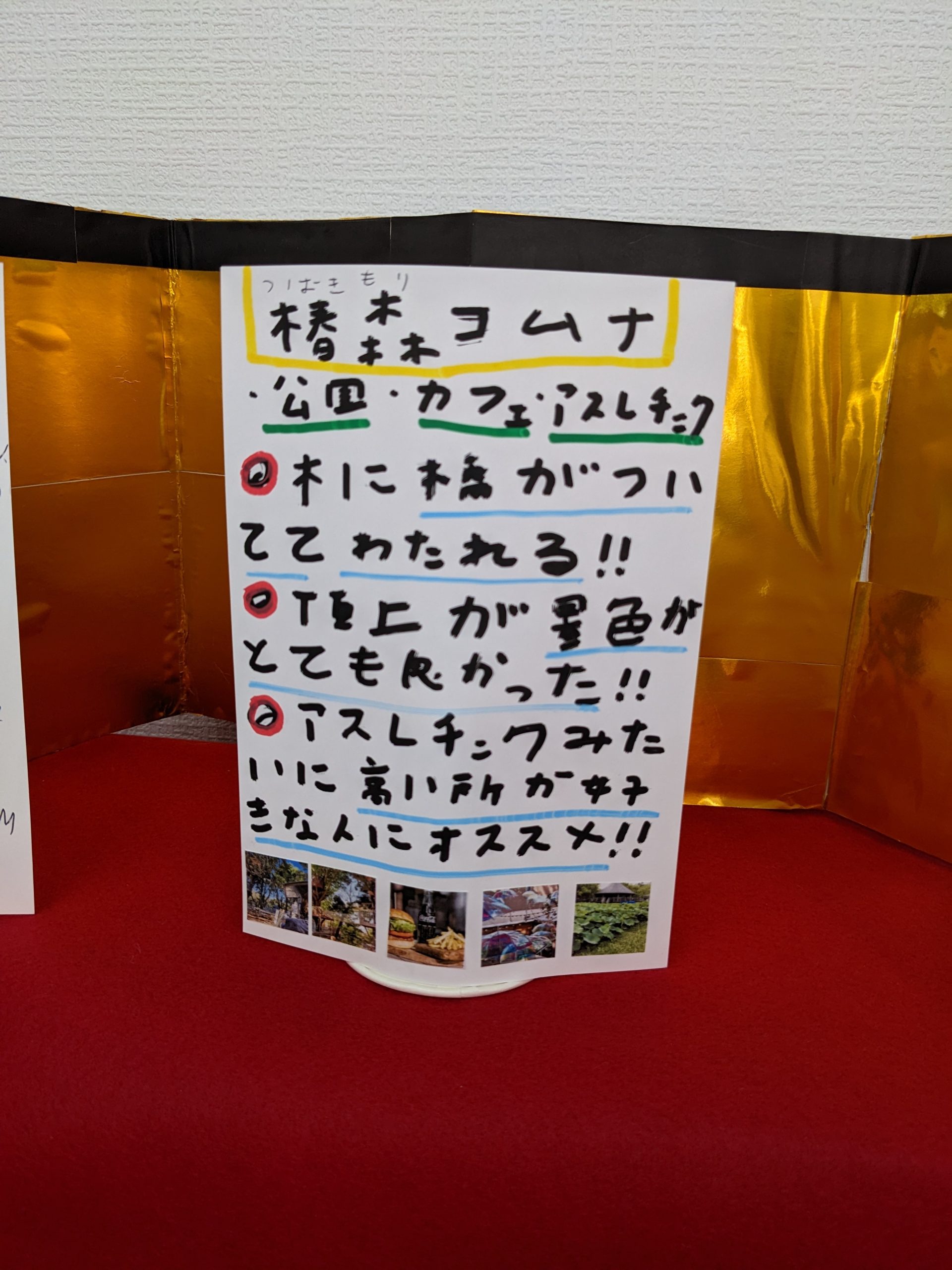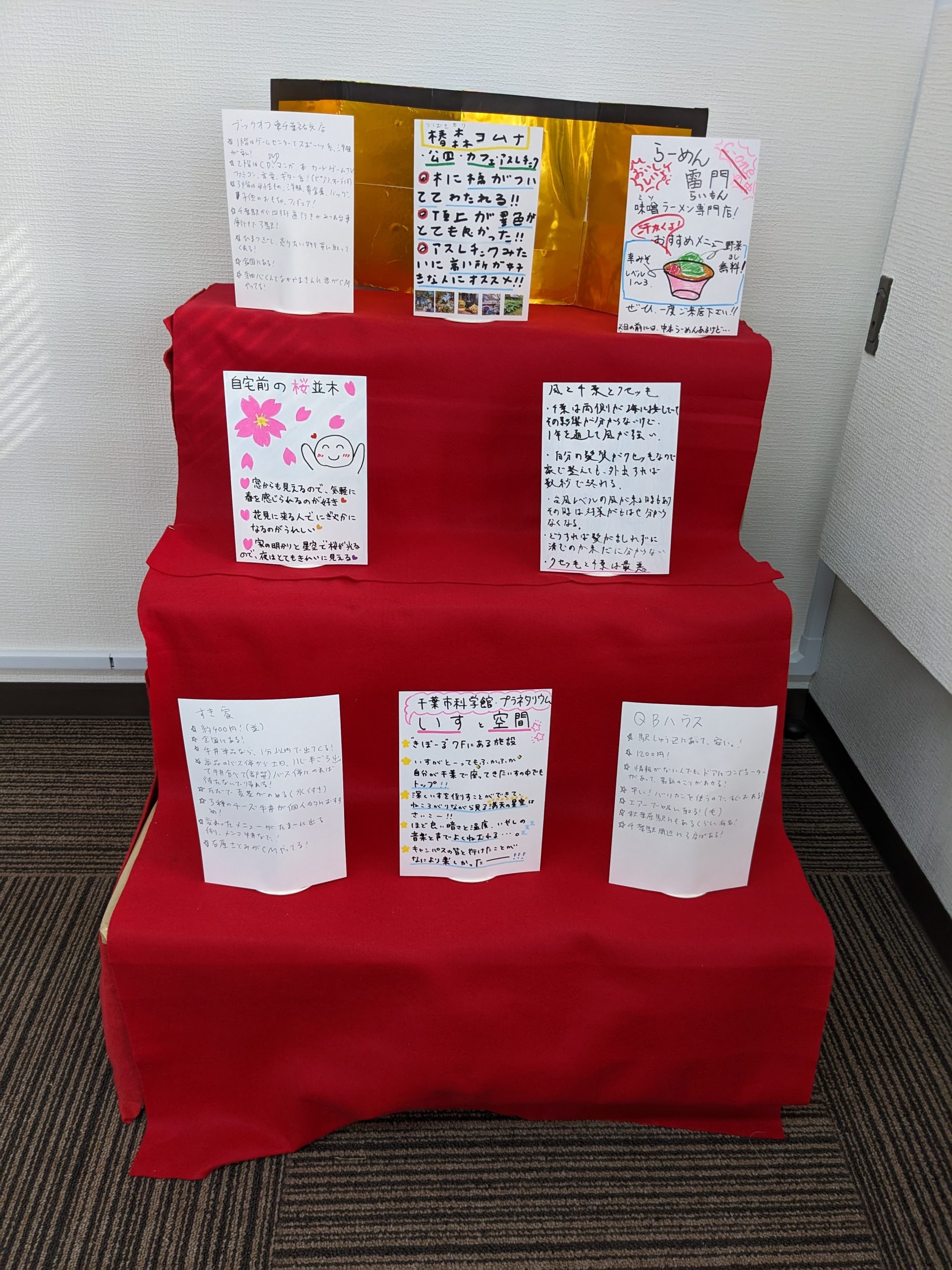 千葉キャンパスでは、メンバーさんそれぞれが感じる「千葉の魅力(みりょく)」をカードに書いてくれました。一度、行ってみたいなと思うものがいっぱいありましたので、いくつか紹介します。