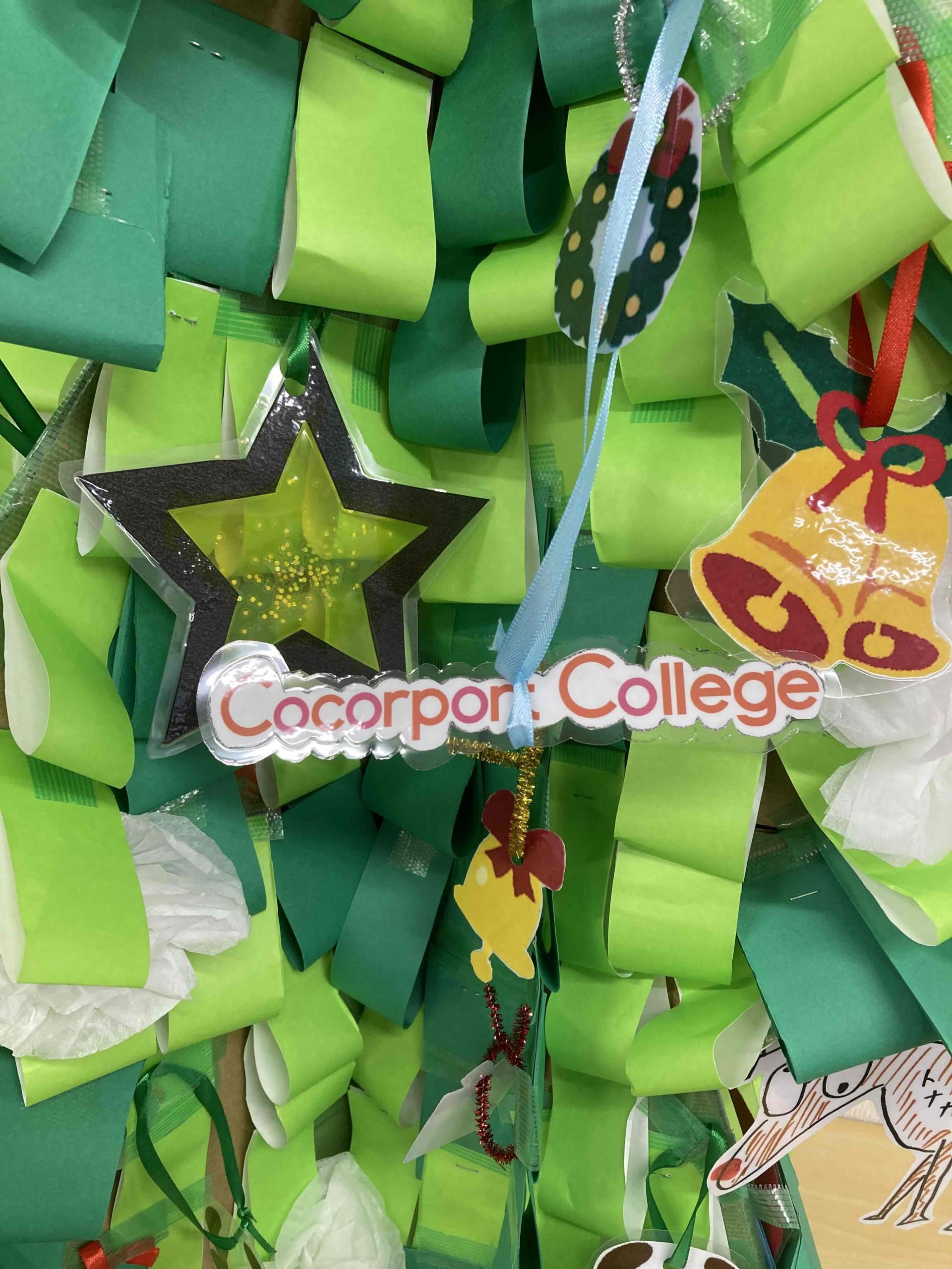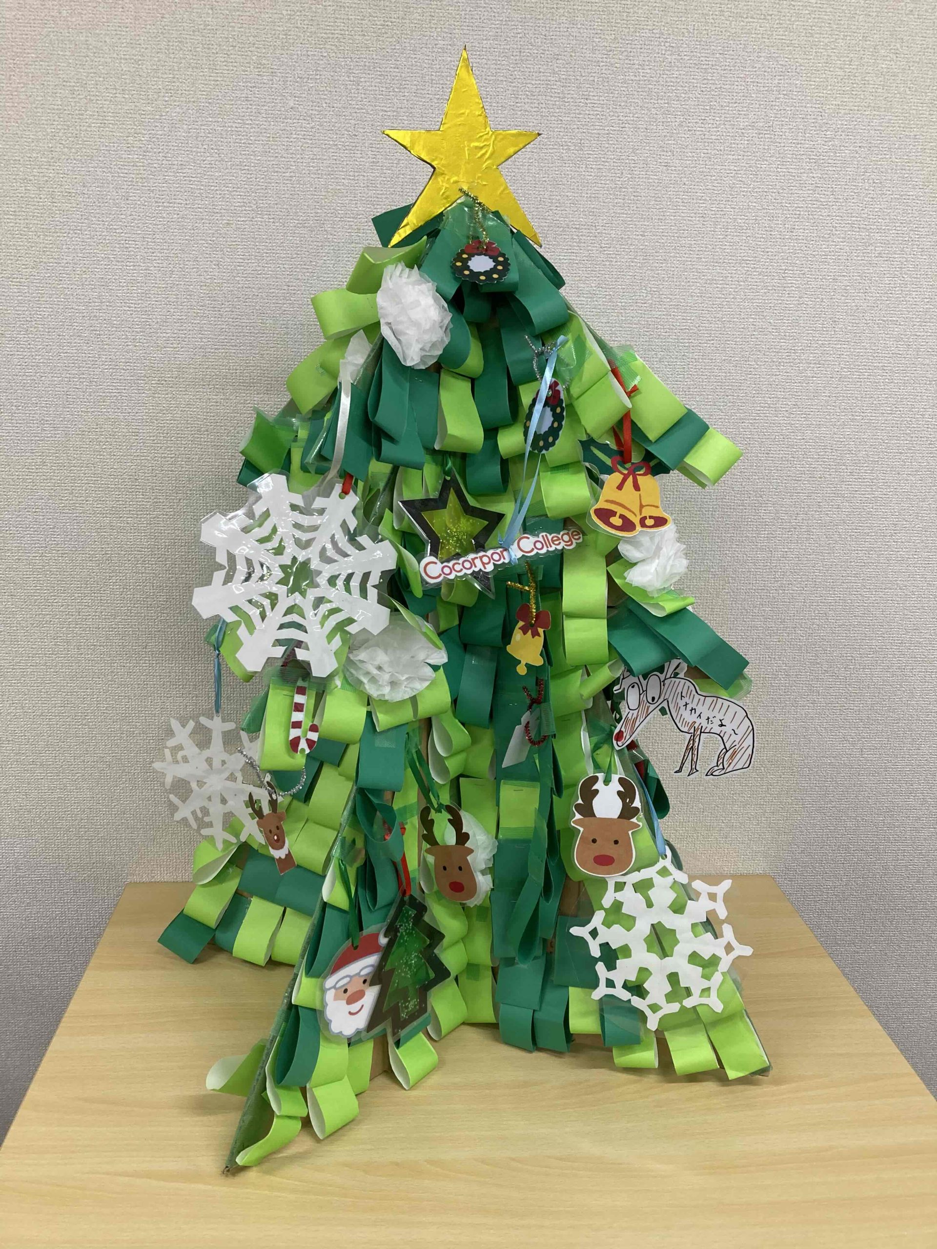 こちらのクリスマスツリーはなんとすべてが手作り。1つ1つの飾りはもちろん、クリスマスツリー自体も段ボールや画用紙を使って作成しました!!