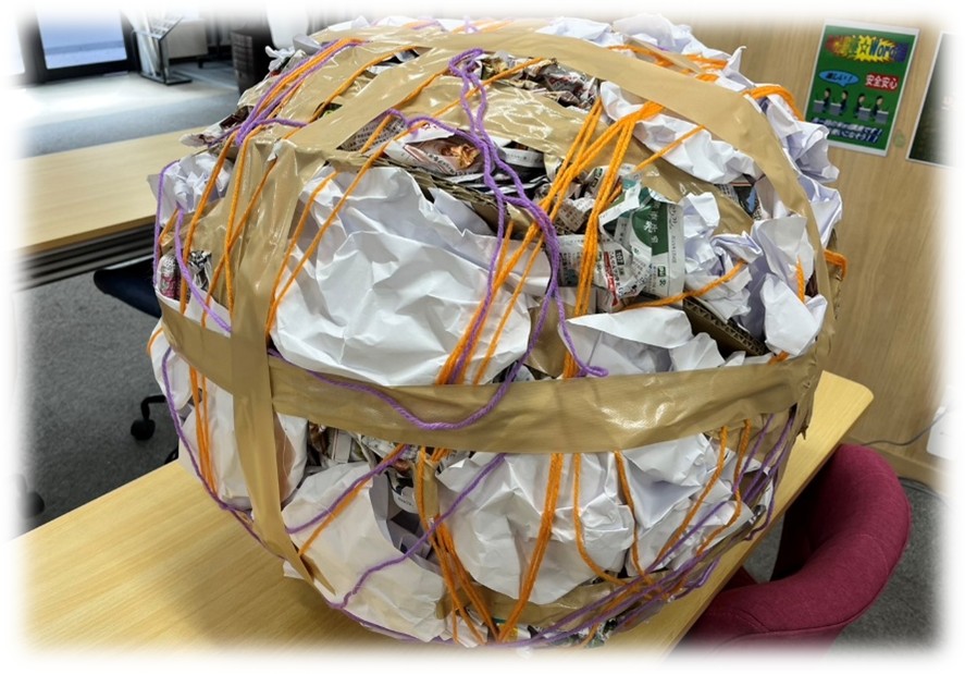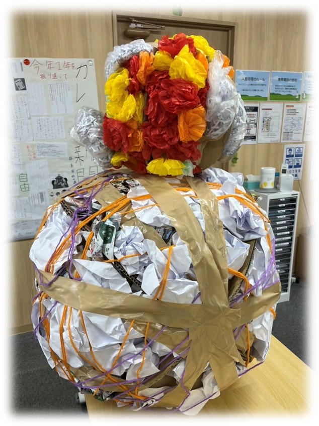 実はひよこちゃんの体の中身は、土台の段ボールに今までに作成した花紙のポンポンや、シュレッダーのゴミを袋に詰めた物などを張り付けています!