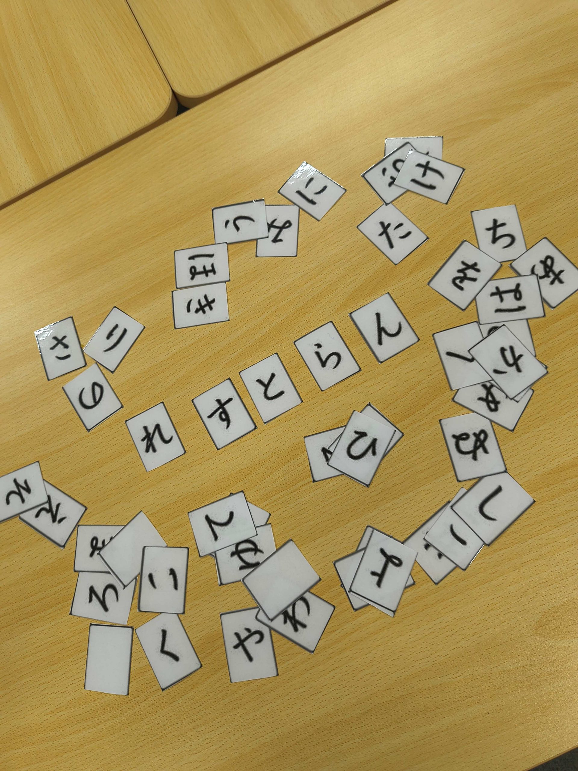 写真のような50音のひらがな文字カードを組み合わせて、なるべく文字数が多くなる言葉を考え、チームで競い合いました。勝ったチームは、あまり聞いたことがないような海外の国名を12文字の言葉にして勝利しました。世界にはこんなに長い国🏳🌈の名前があるとは驚きです!