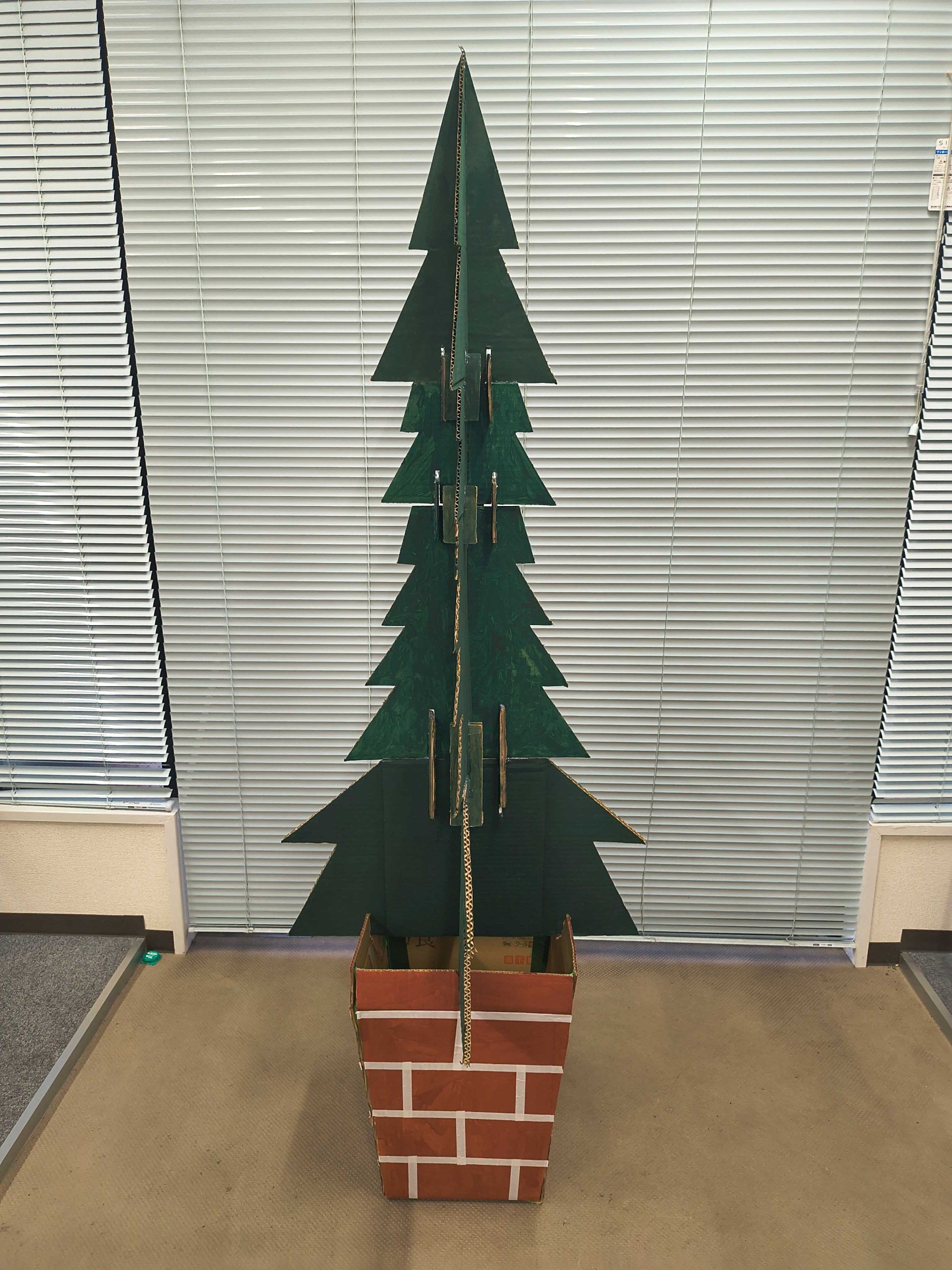 また12月といえばクリスマス🎅です。船橋駅前キャンパスでもクリスマスに合わせて、飾り付けの準備を始めました。クリスマスの飾り🎉といえば何といってもツリー🎄が主役ですよね。11月の最終週のおしごと体験プログラムで、クリスマスツリーのツリー本体の製作に取り組みました。プログラムでは、ご利用者の皆さんで協力しながら材料の段ボールにグリーンの色を塗り、鉢🧱には茶色の色を塗って飾り付けする前のクリスマスツリーが完成しました。素敵な色合いですね!