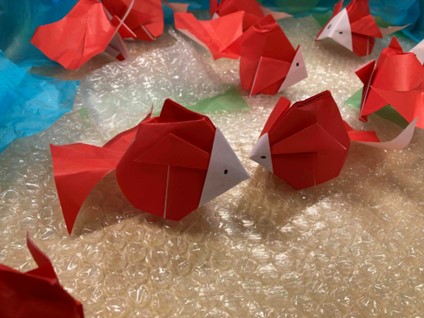 折る工程を確認しつつ、立体的な金魚を作成しました。