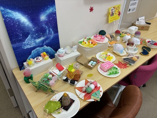 そして中に入るとメンバーさんのこれまでの作品が展示されています!お弁当やスイーツを作ったものが多く、ビュッフェ風になっています(笑)