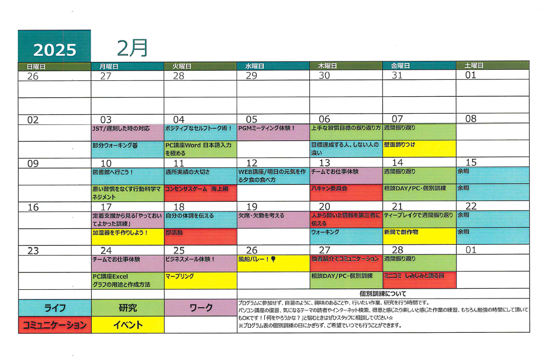 生活、コミュニケーション、研究、イベント、仕事の5つのカテゴリーに分類され、約500種類のプログラムを集合プログラム、個別プログラムで提供しています。