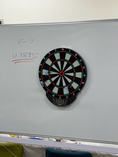 真ん中のブルに当てるメンバーさんもちらほら。みんなで点数を競いました。