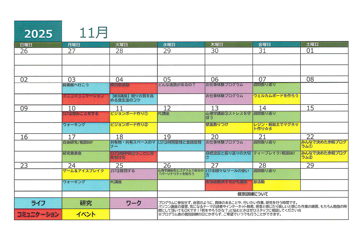 【八王子駅前キャンパス】11月のプログラム表と壁面紹介🎨【自立訓練】