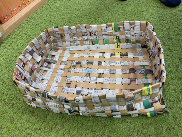こちら・新聞と段ボールの切れ端を利用して作成した網かごです…大きさもカバンを収納できるくらいあるのです。