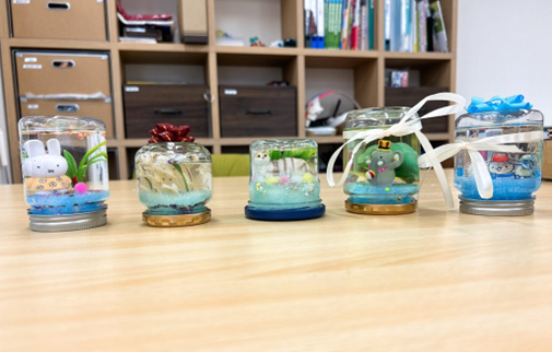 様々なマスコットやお花、ラメを瓶の中に詰めて