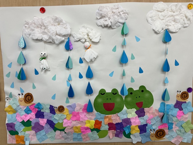 梅雨の季節ということで、あじさいと雨の壁画を作成しました。