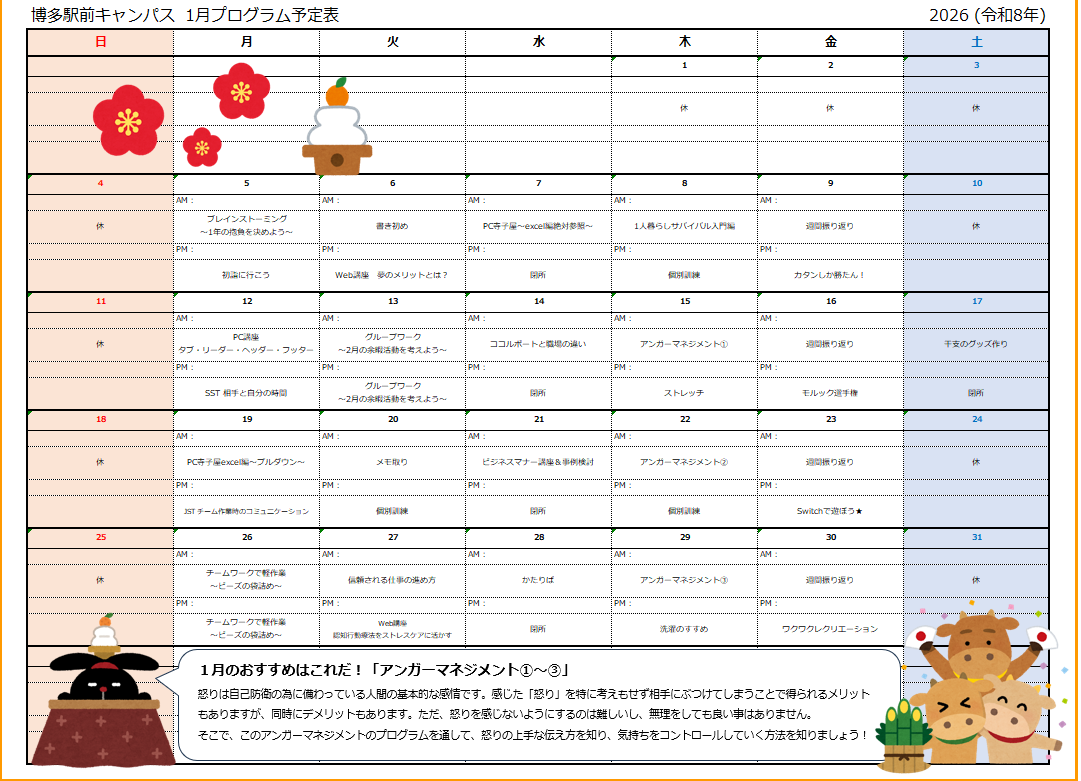 【博多駅前キャンパス】🎍🐎1月のプログラム表🐎🎍