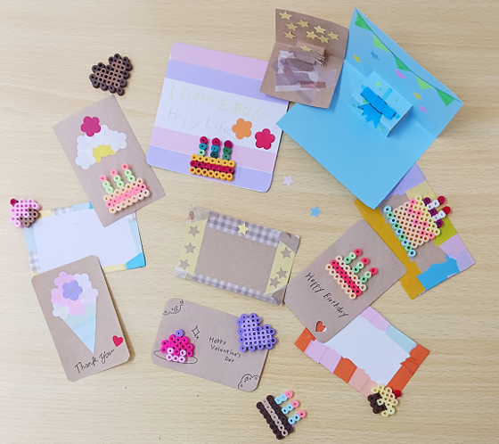 アイロンビーズで思い思いの形を作りカードに貼ったり、マスキングテープなどを使ってお洒落で色鮮やかなカードを作る方もいらっしゃいました🔆