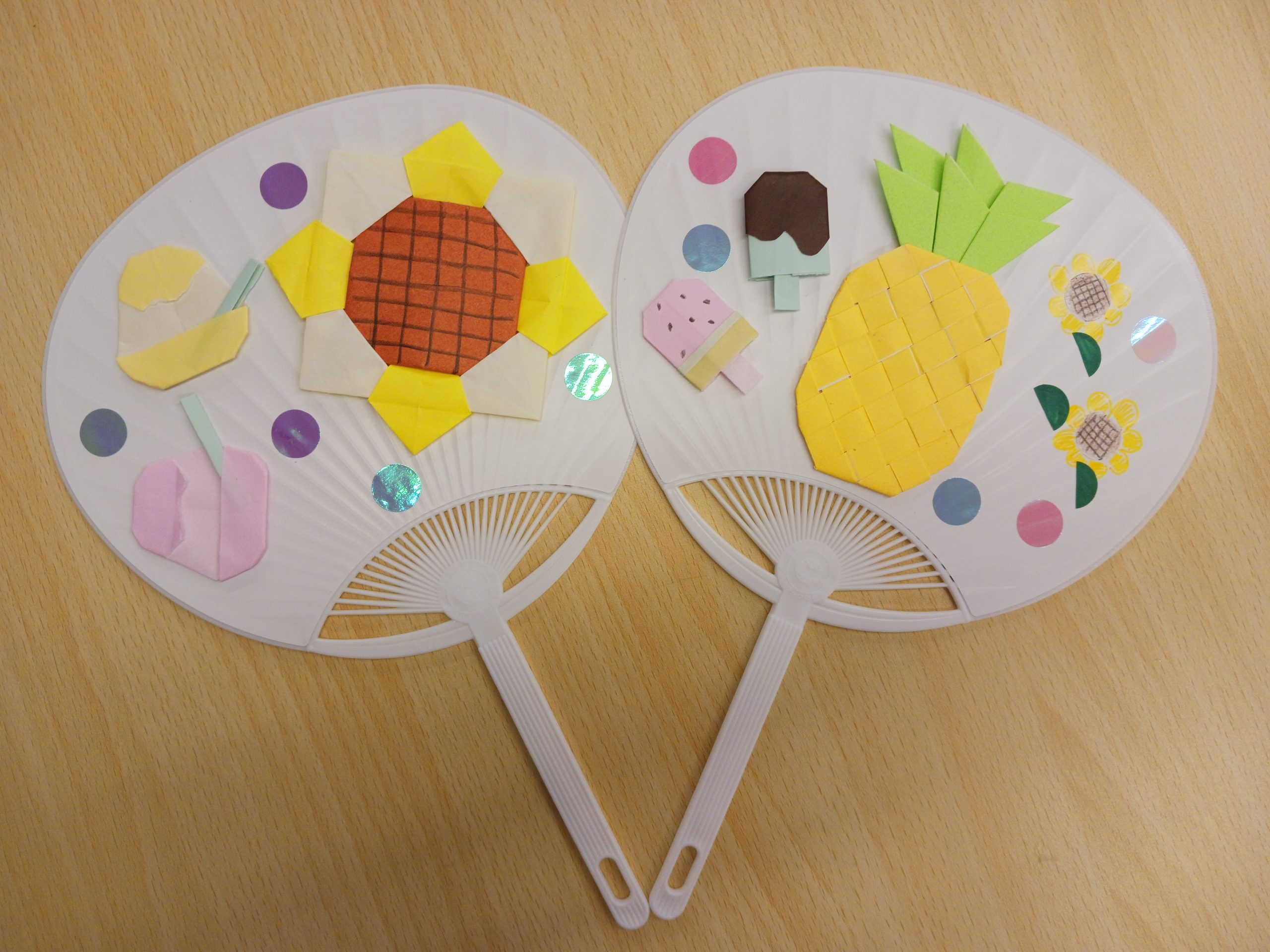 夏をイメージしたイラストや、折り紙を使ってうちわに飾りつけをして素敵なうちわができあがりました🍉🍍🍧🍦