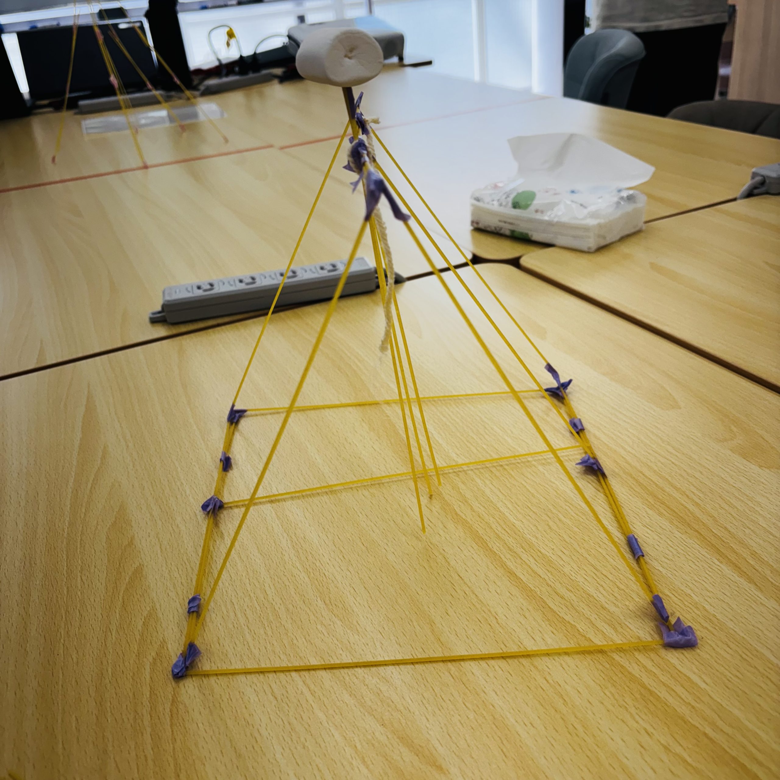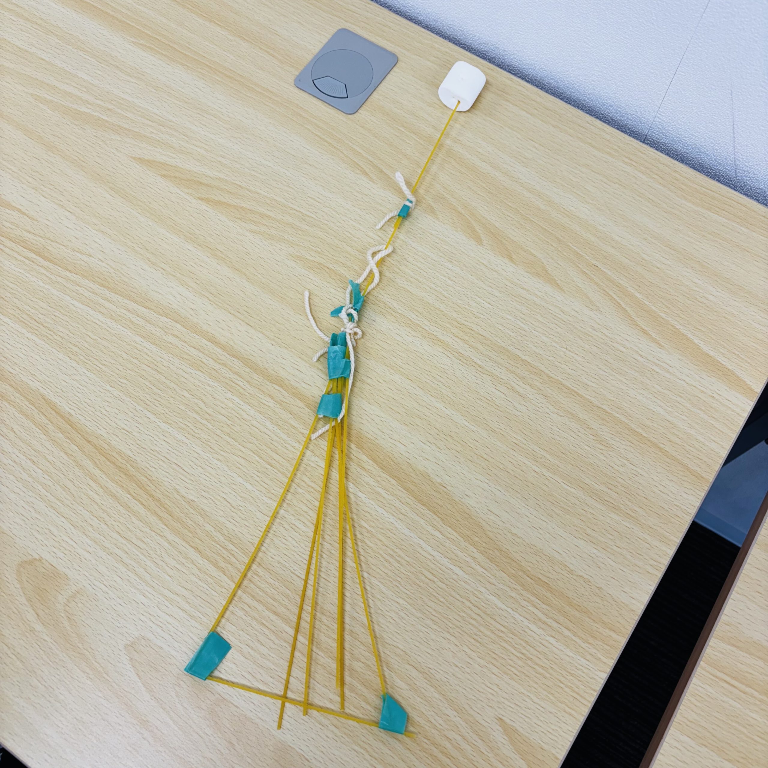 チームで協力して、制限時間20分以内にパスタ20本、90㎝のヒモ、90㎝のテープを使って