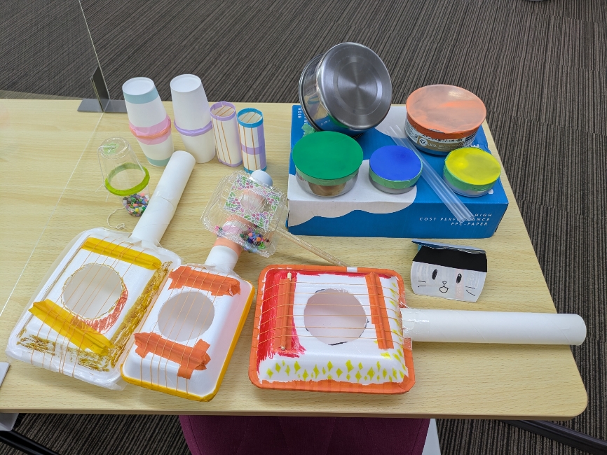 1時間で様々な楽器を作成いたしました。結構いい音が鳴りますよ!