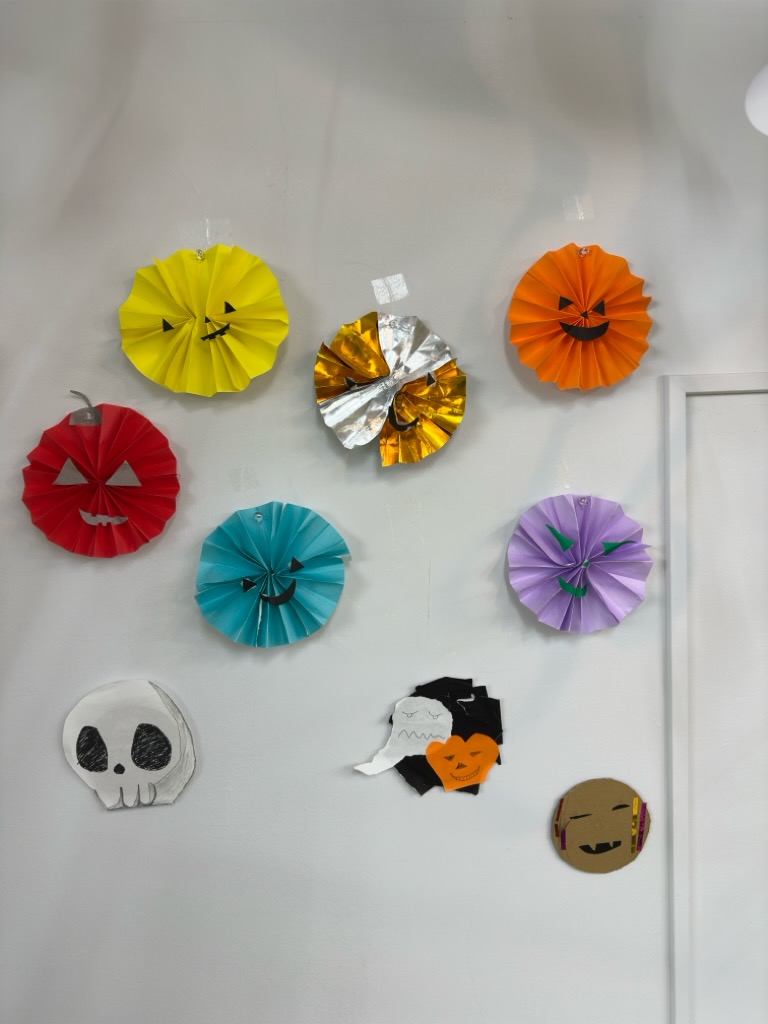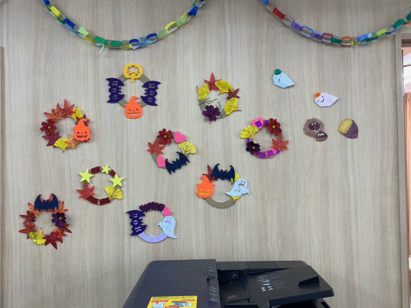 キャンパスのとある壁には、ハロウィンと秋のリースが飾ってありますよ~