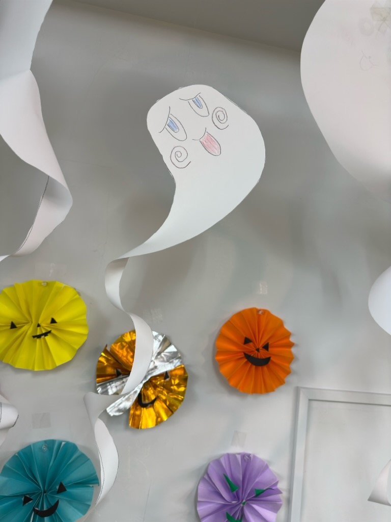 壁にもジャックオランタン!そして天井からお化けがぶら下がっています!