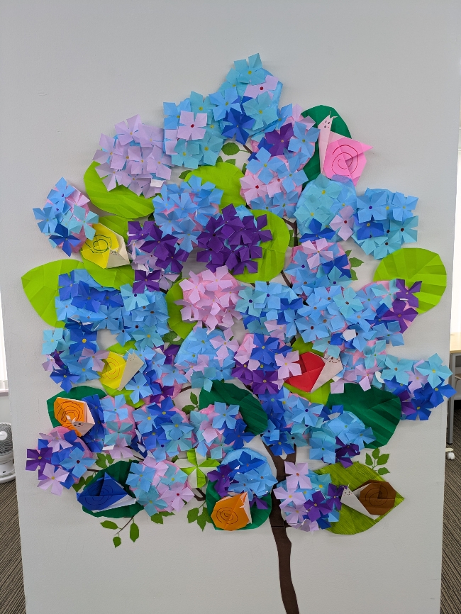 現在柏キャンパスの壁は皆で作成したアジサイが満開です!よく見るとカタツムリもいま~す🐌