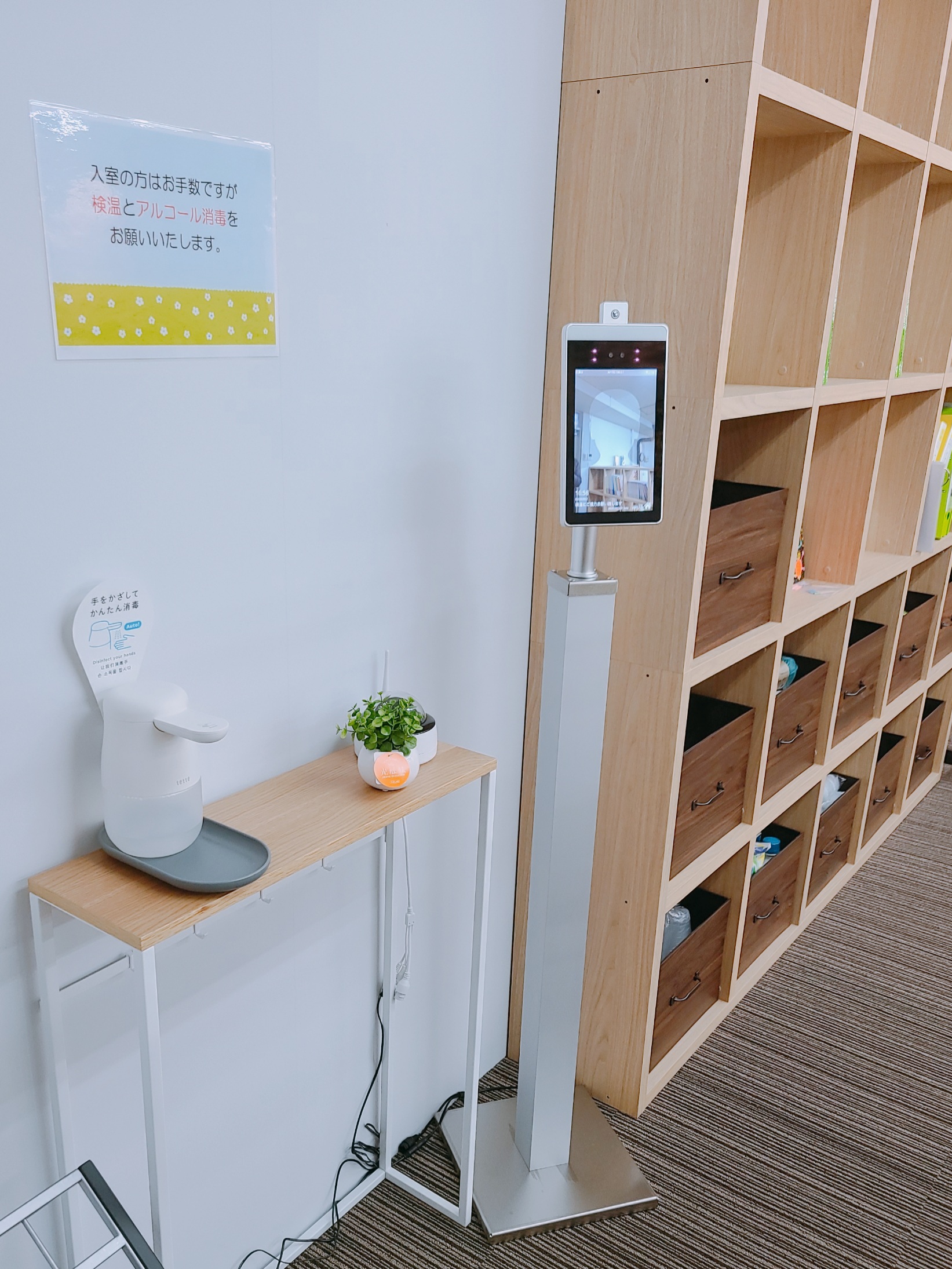 柏キャンパスで安心してお過ごしいただけるよう、入口に非接触型のアルコール消毒、検温モニターの設置をしております。