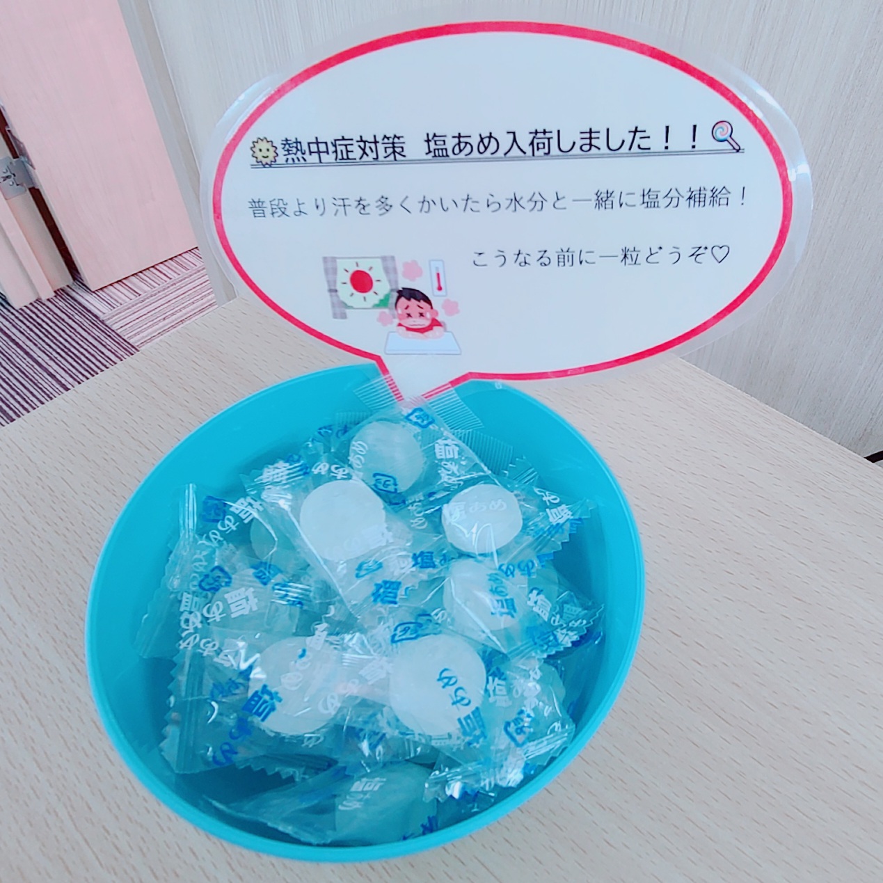 ドリンクサーバーでいつでも水分補給し、汗を多くかいた時には塩アメで塩分チャージ!