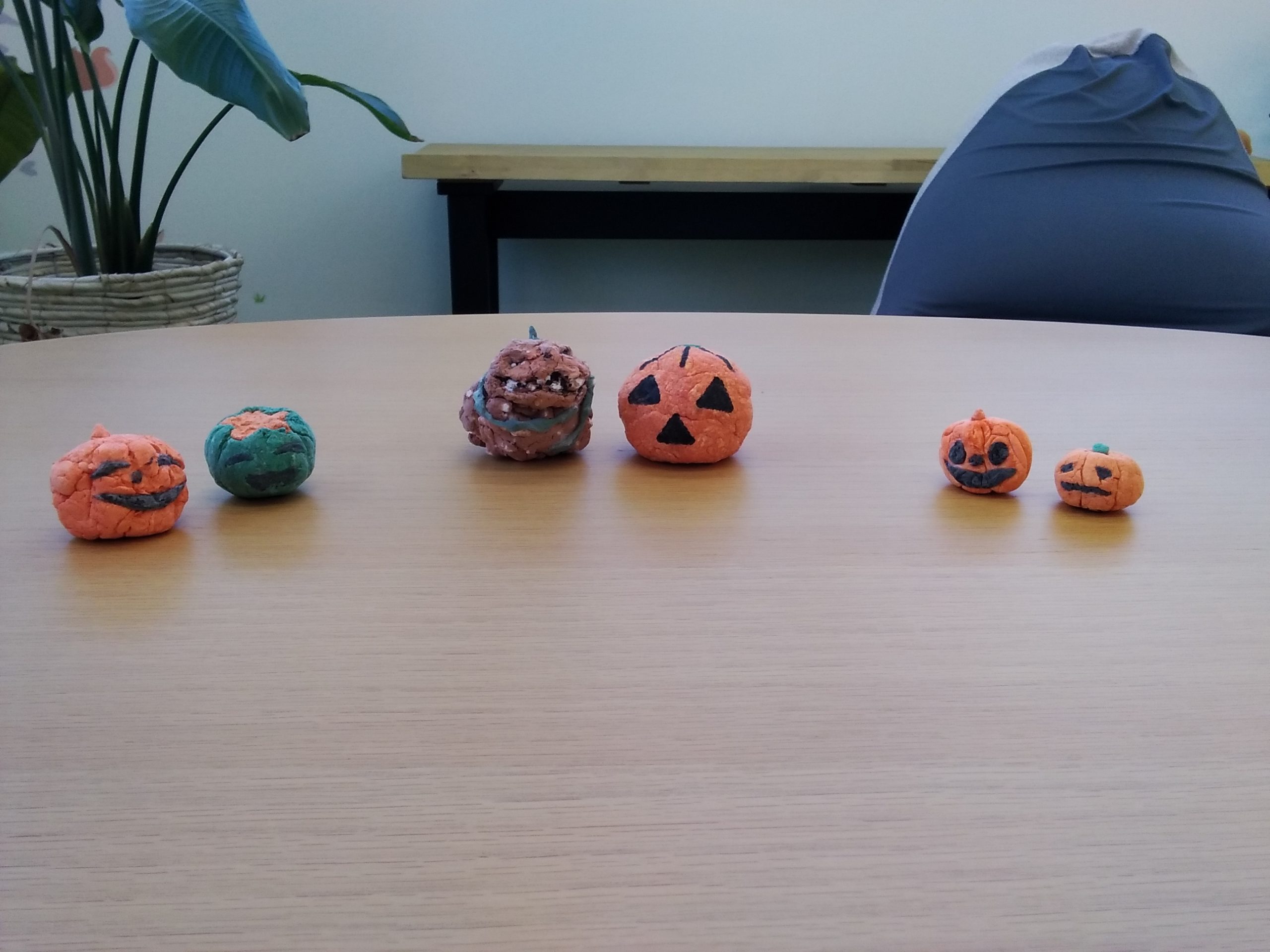 個別訓練プログラムの時間を使って利用者様に粘土を使ってかぼちゃモンスターを作っていただきました。当日の朝、スタッフがキャンパス内に隠し参加者に探していただきます。