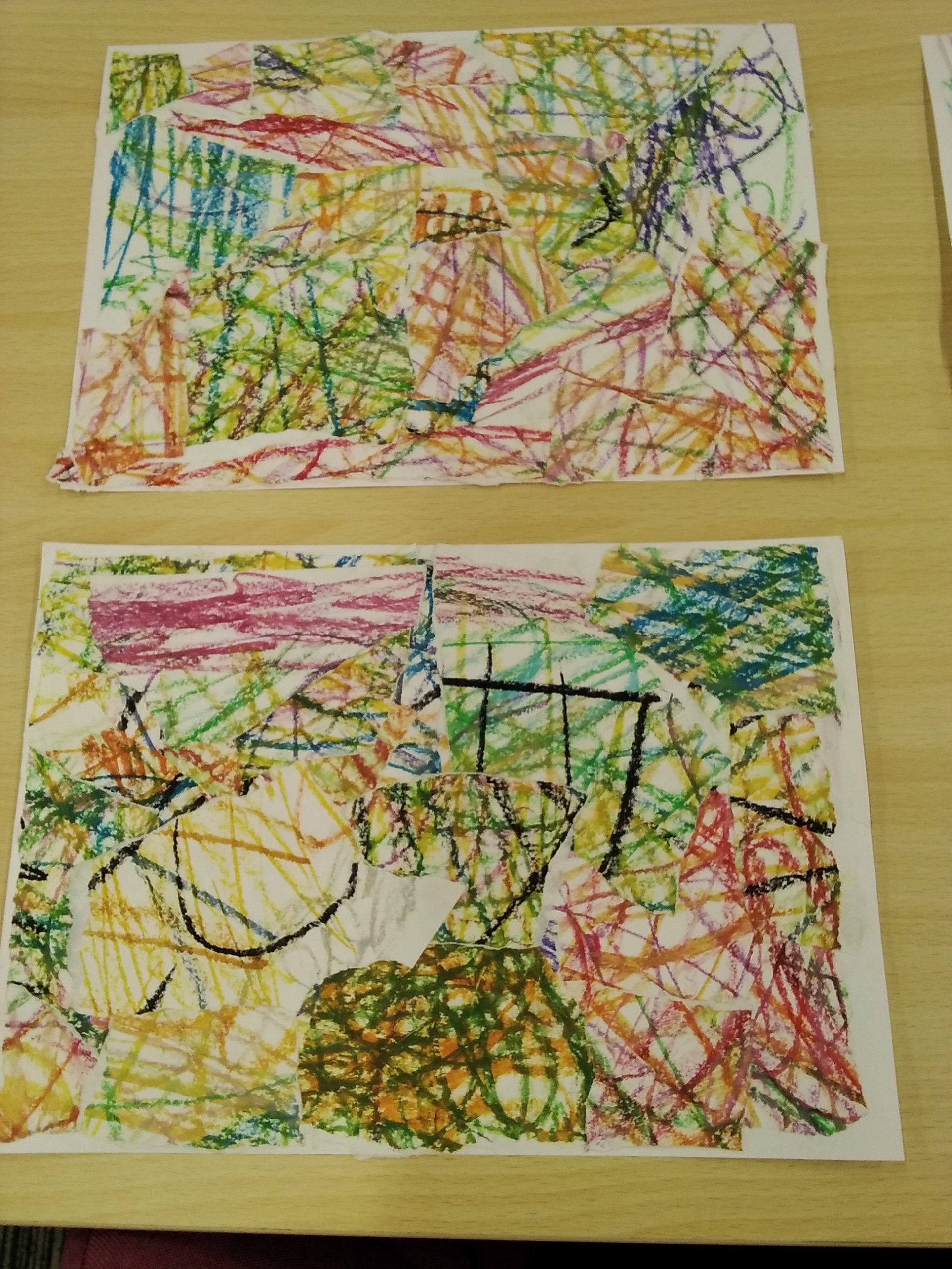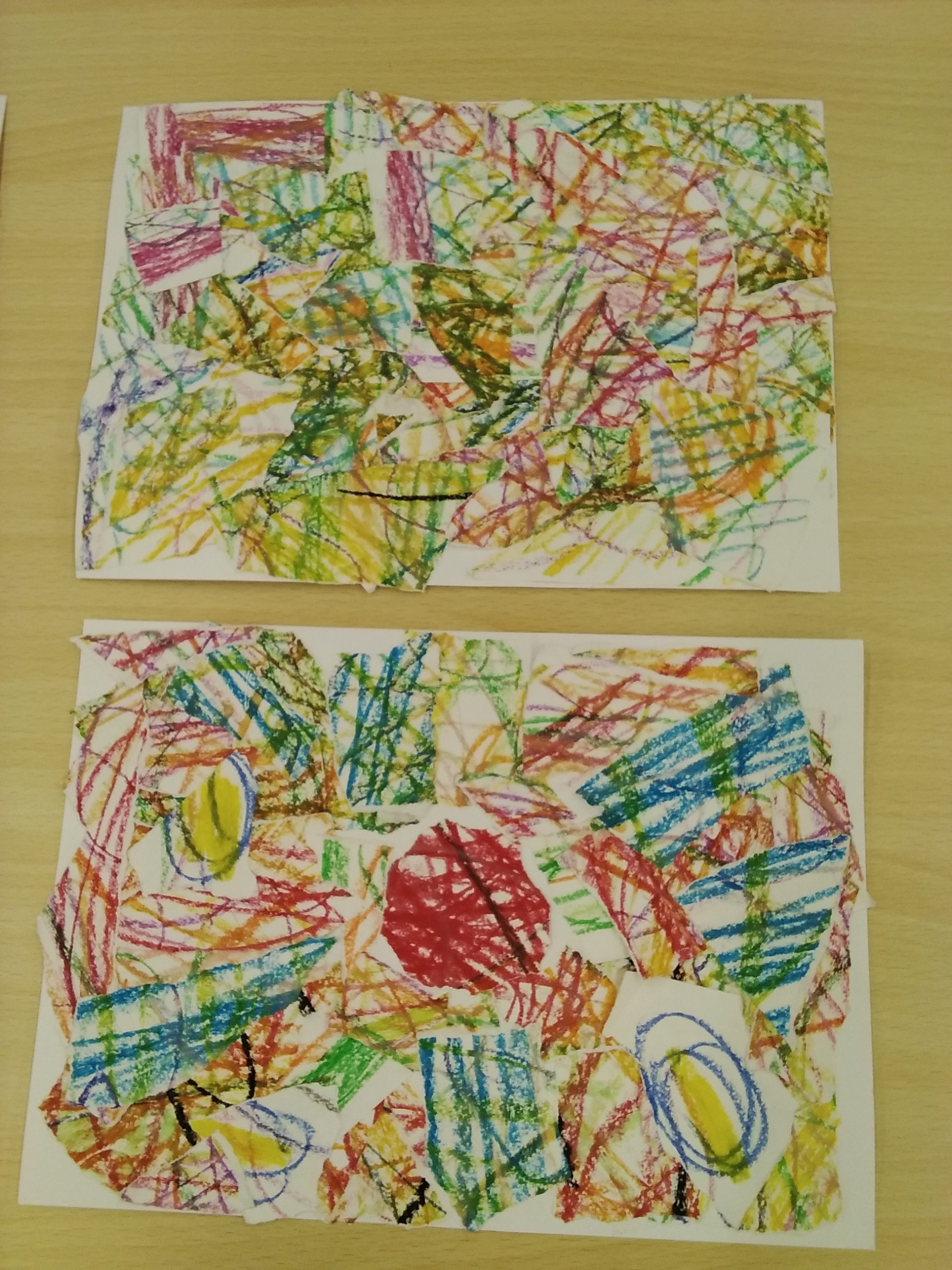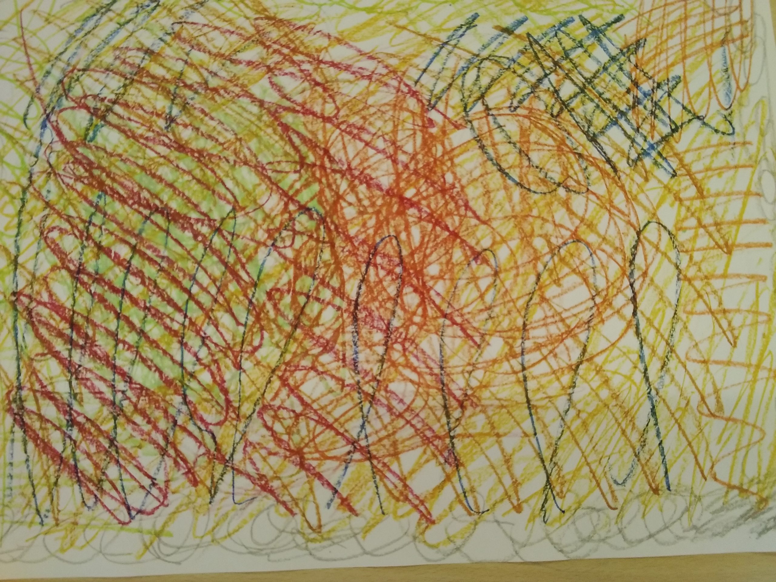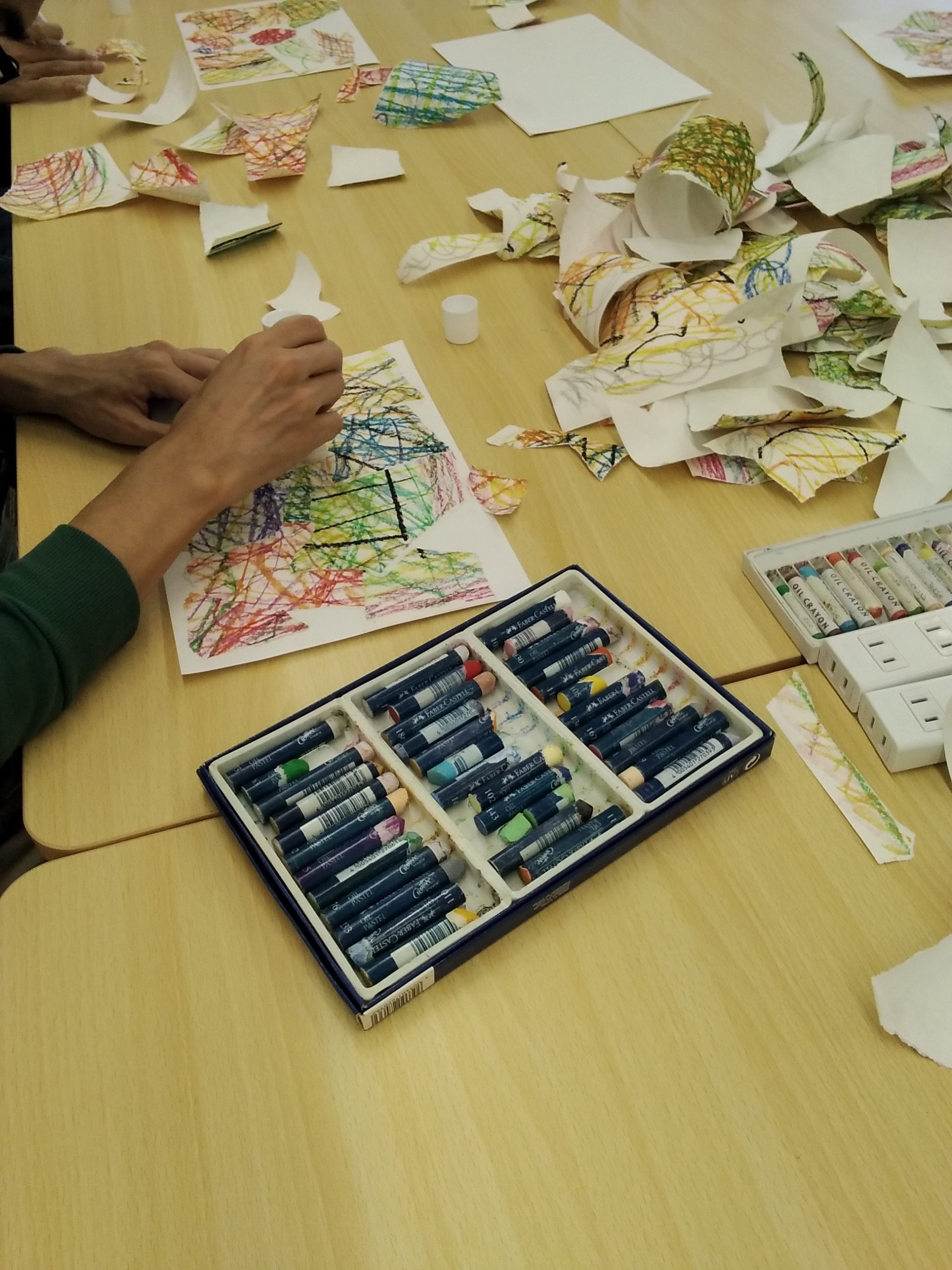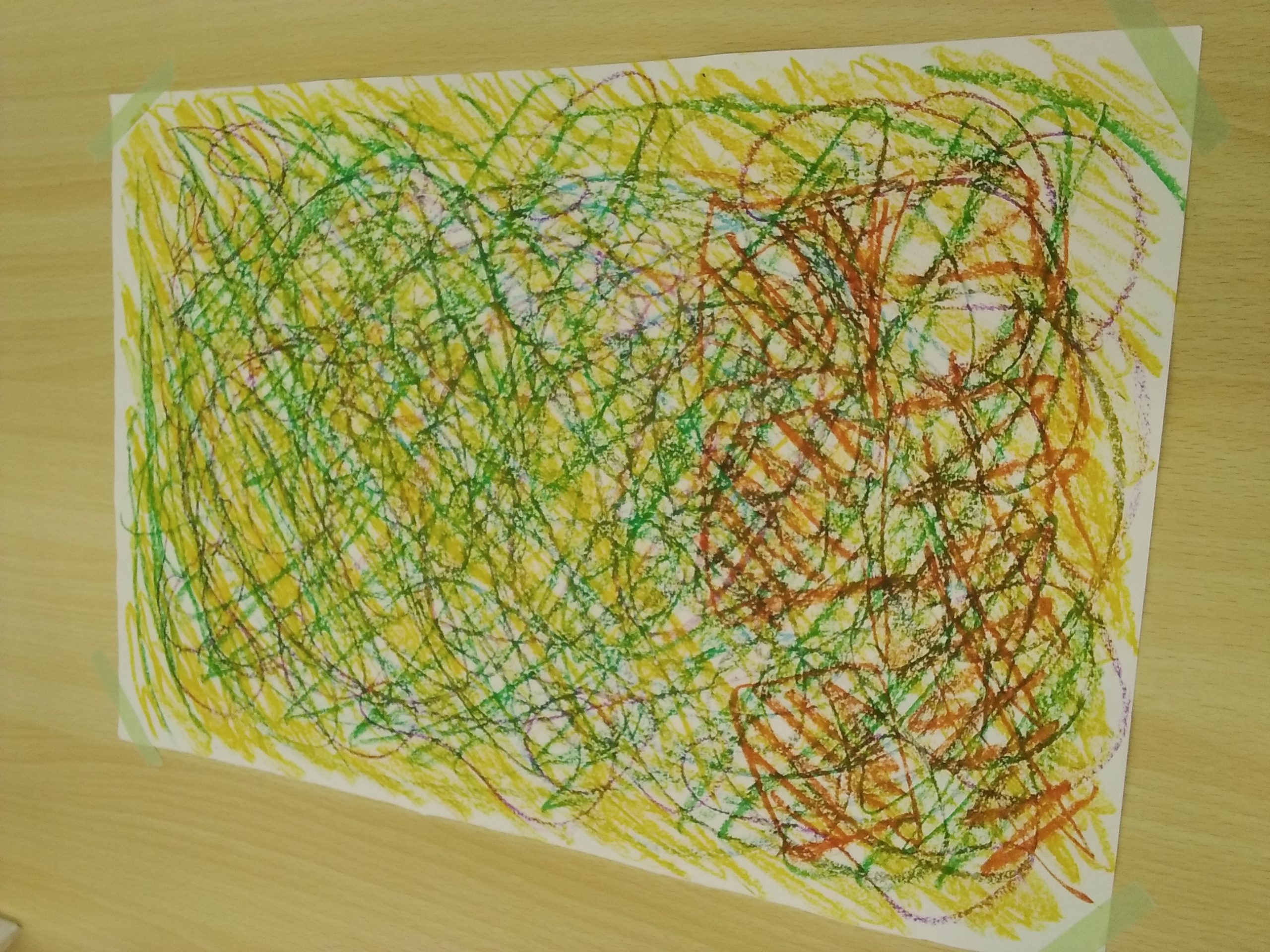 大きめ真っ白な紙にクレヨンを使い今の気持ちを色で例えると何色?形にしたらどうなる?というのを想像していただき、