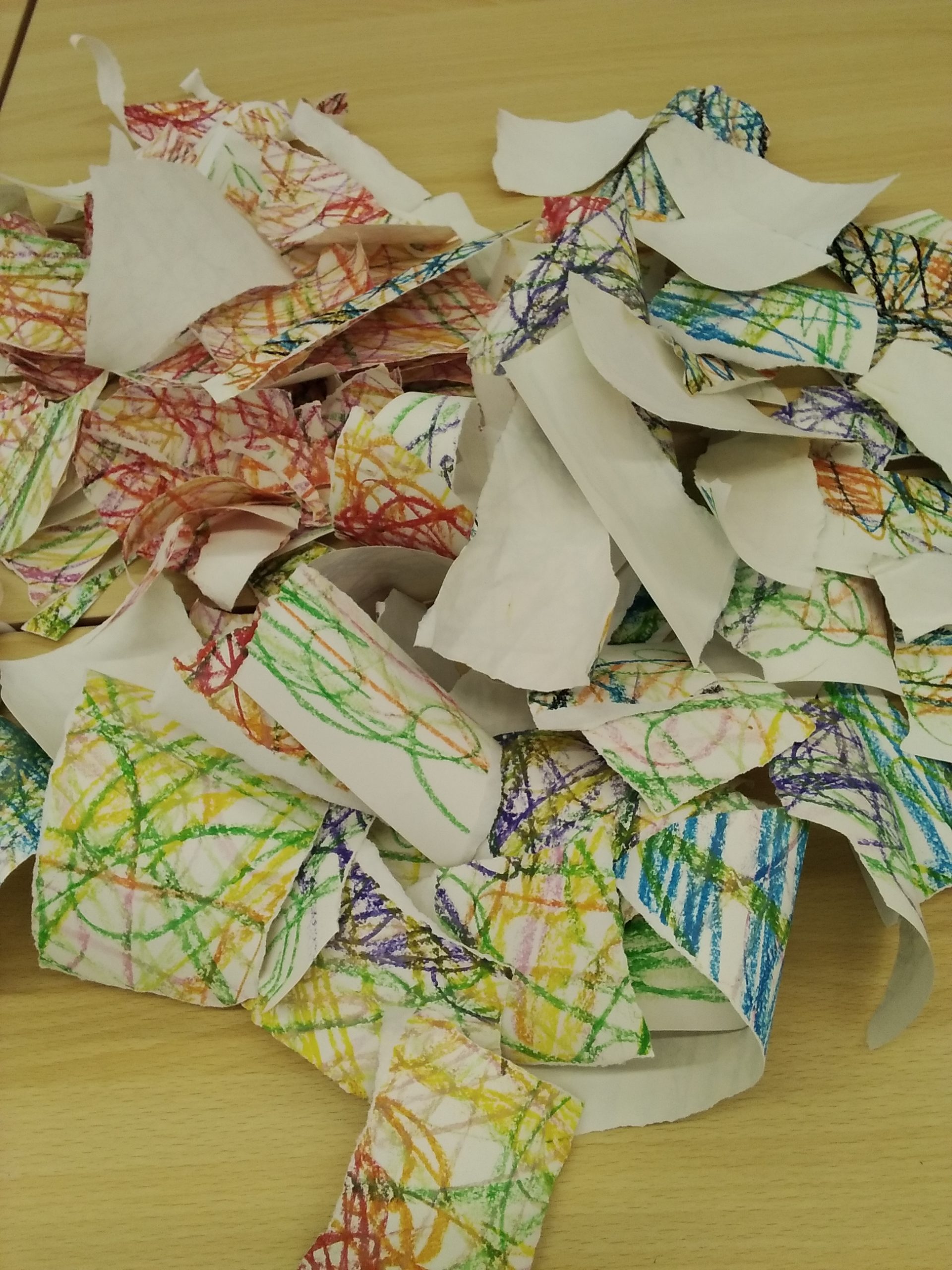 ビリビリに破った切り抜きから新しいものへ生まれ変わらせていきます。