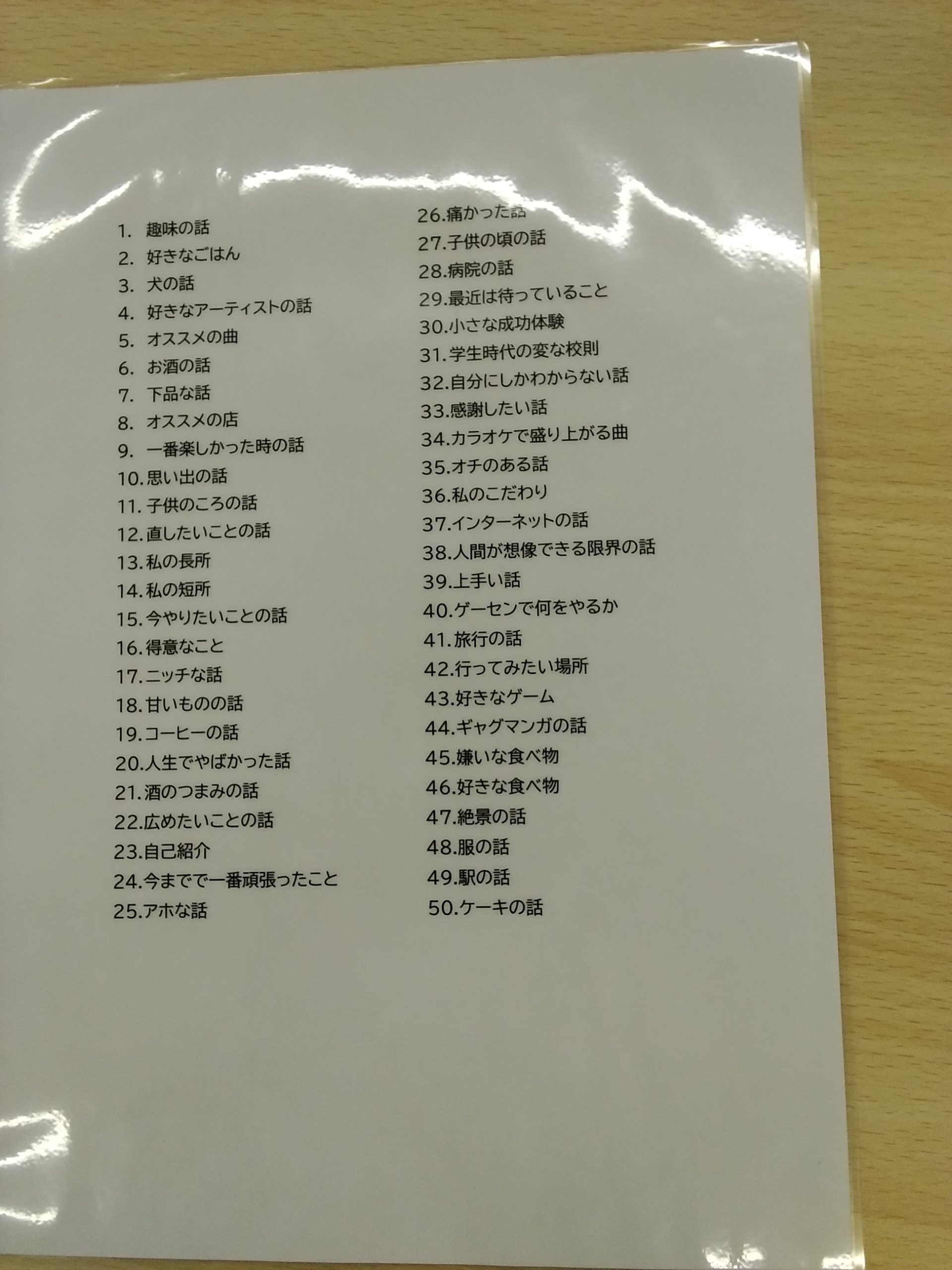 「深海魚の話」「好きなお店の話」というように、マニアックな?お題から話しやすいお題まで様々な種類があります。