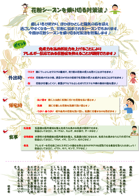 裏面では、花粉シーズンを乗り切る対策法を取り上げ。また、ブログ版の月刊誌では残念ながらアップすることはできないのですが、おすすめ図書コーナーでは、前任の月刊誌担当者さんから、おすすめ図書に関する素敵な紹介文をいただきました!ありがとうございます♪