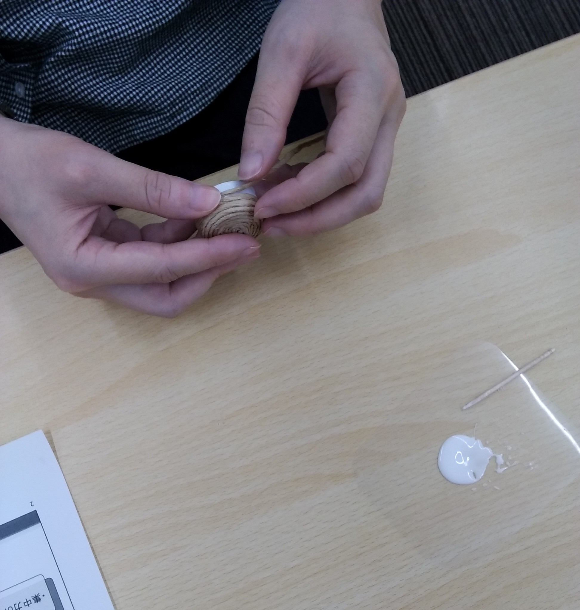 作業工程はとても簡単で、ペットボトルのキャップの周りにボンドをつけながら紙紐をぐるぐると巻いていくだけ♪