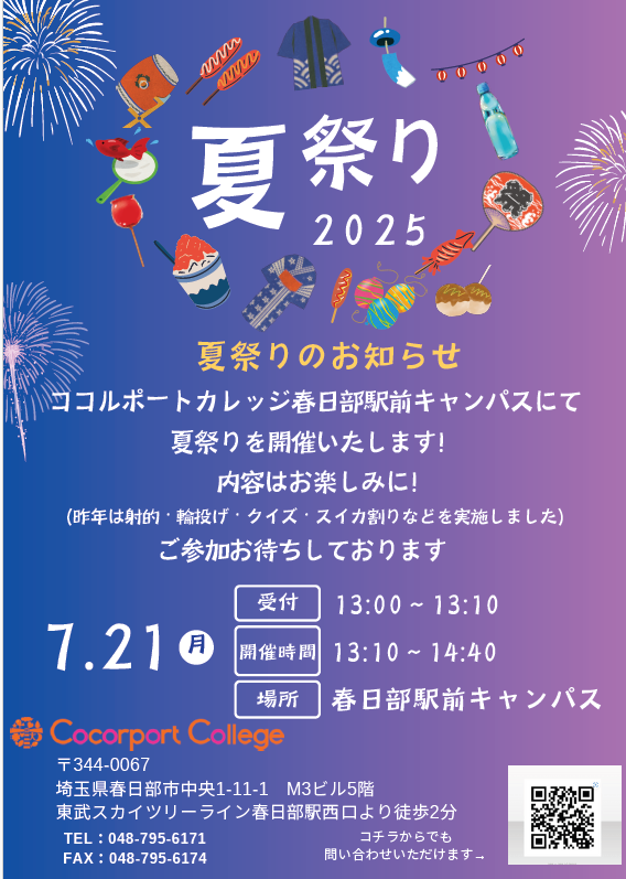 春日部駅前キャンパスでは、今年で3回目の【夏祭り🍧】を開催いたします👏