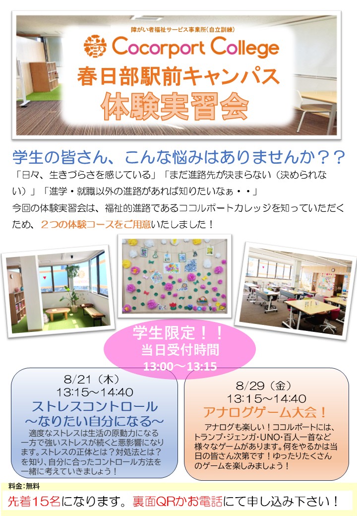 今年もココルポート春日部駅前キャンパスにて、8/21(木)8/29(金)に学生様限定で体験実習会を開催することが決まりました👏🥳