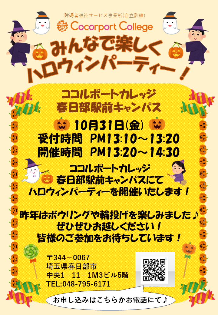 皆さん、春日部駅前キャンパスのハロウィンパーティに奮ってご参加ください❣❣