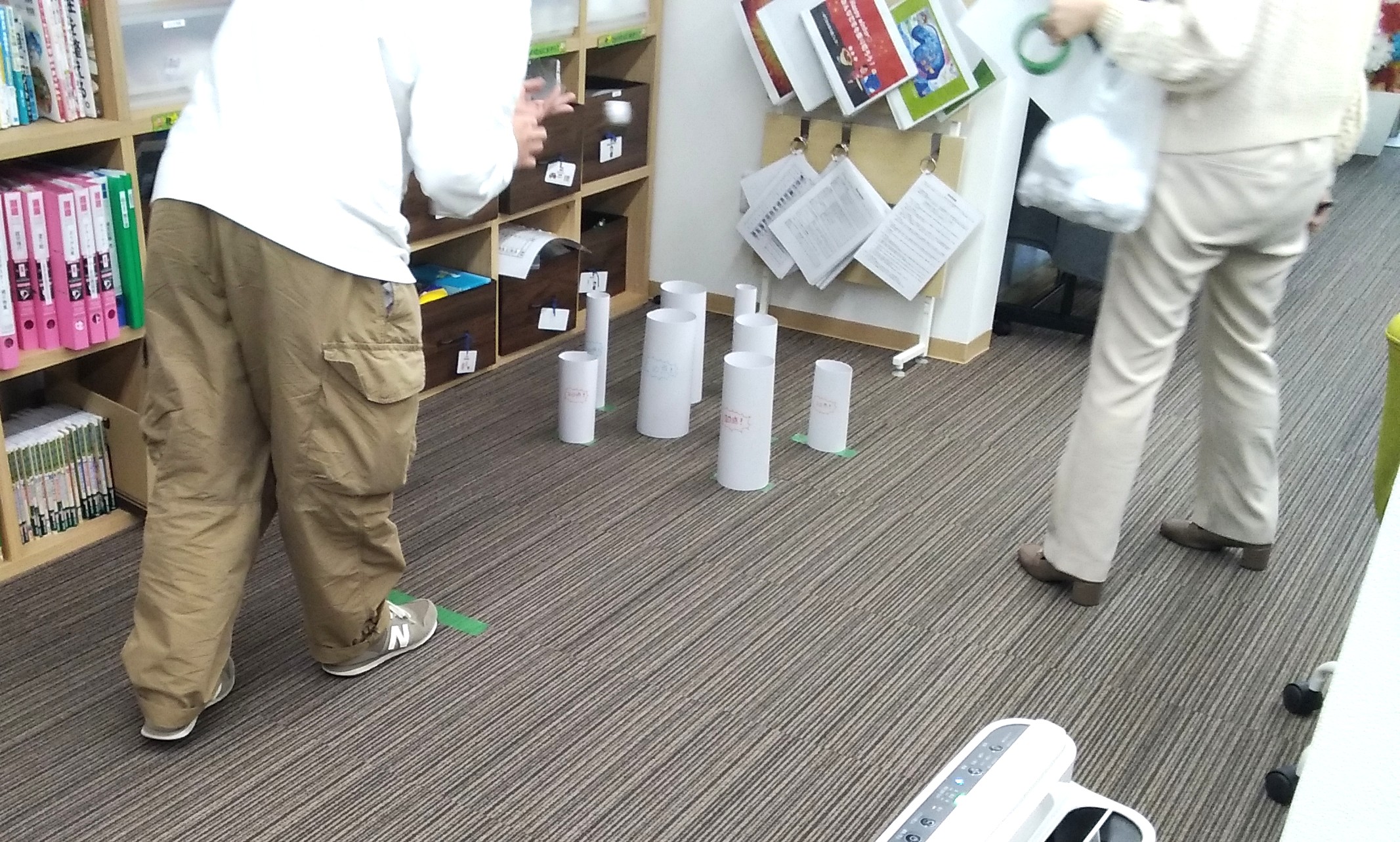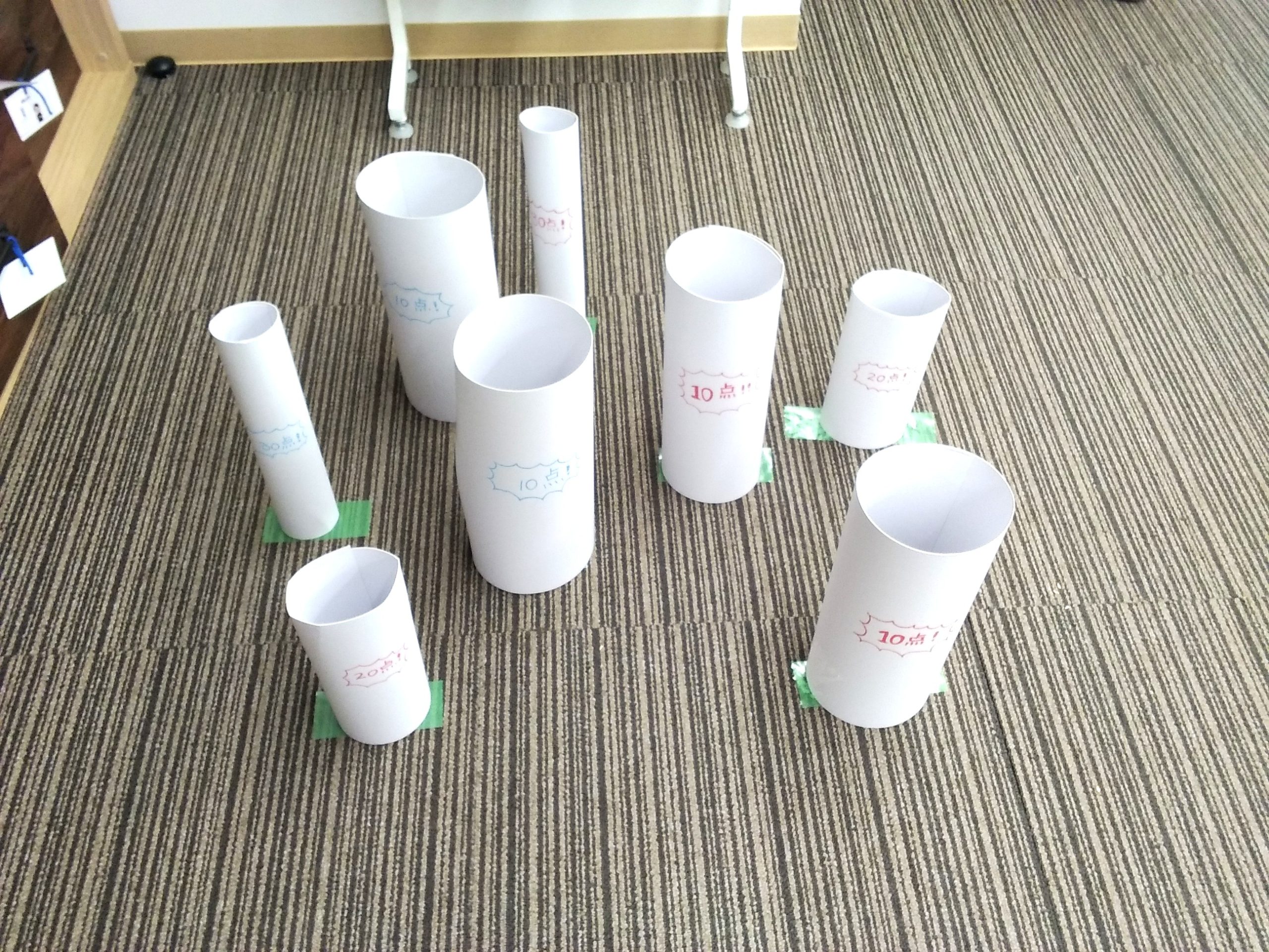 こちらは「サンタさんシミュレーション」の様子です。家の煙突に見立てた筒状の厚紙に、プレゼントを投げ入れるゲームです。細い煙突にプレゼントを入れると高得点となります💪
