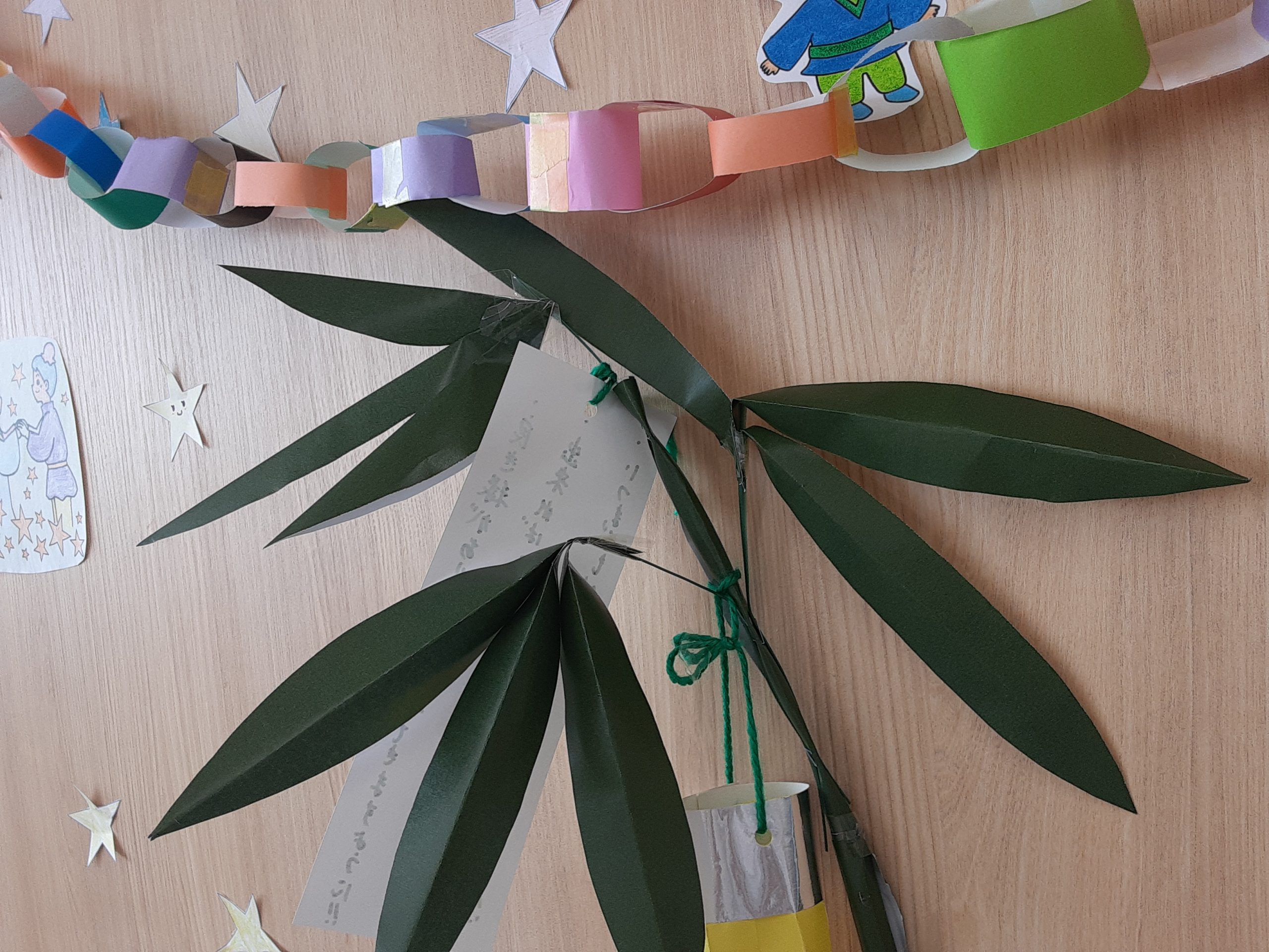 七夕の笹は手作りで折り紙とタピオカのストローを使用し皆さんで作っていただきました。