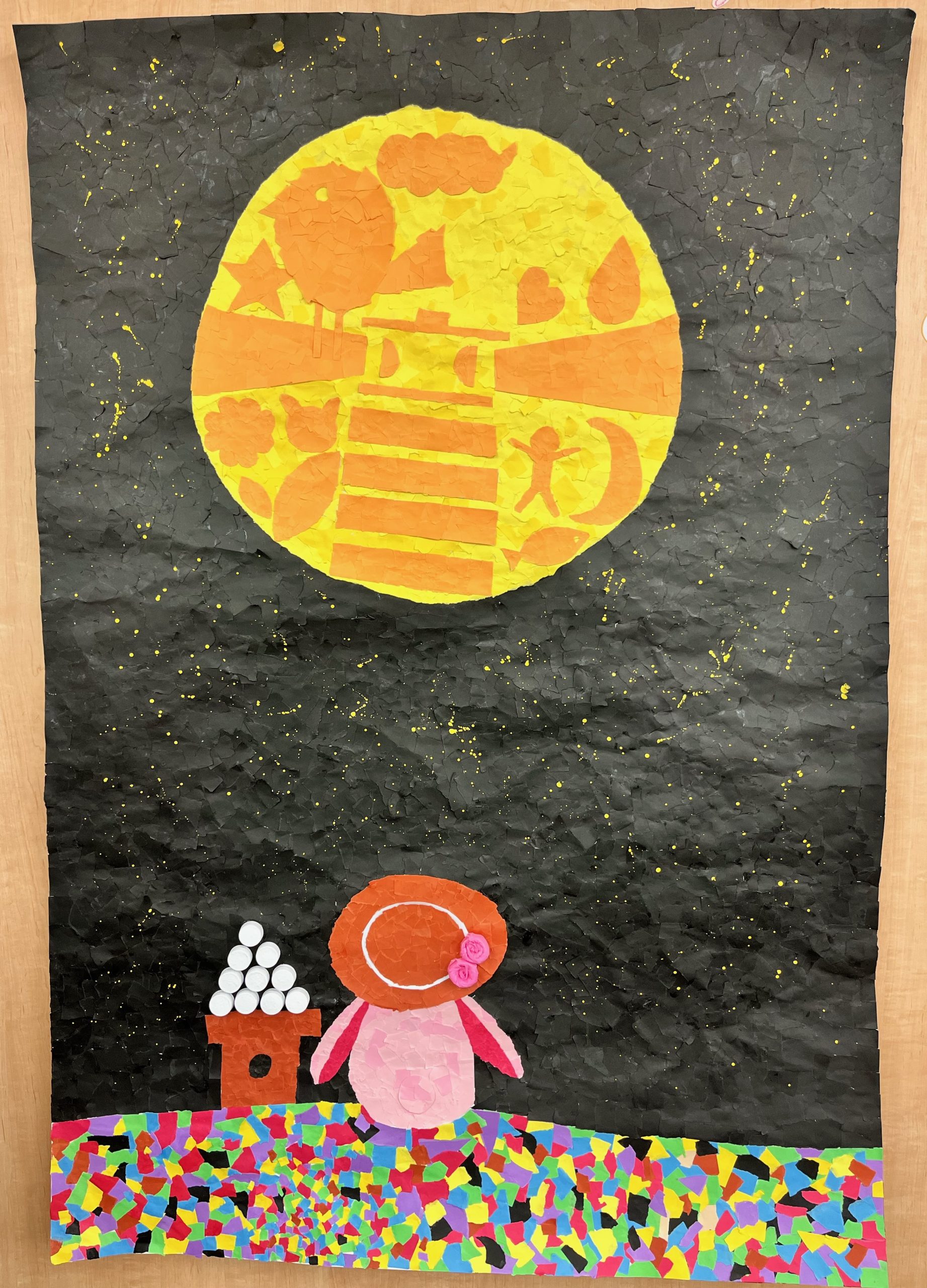 テーマは「お月見うさぎ」です!色画用紙を1つ1つちぎって貼り付け、形を作っていきました。渾身の作品です😊