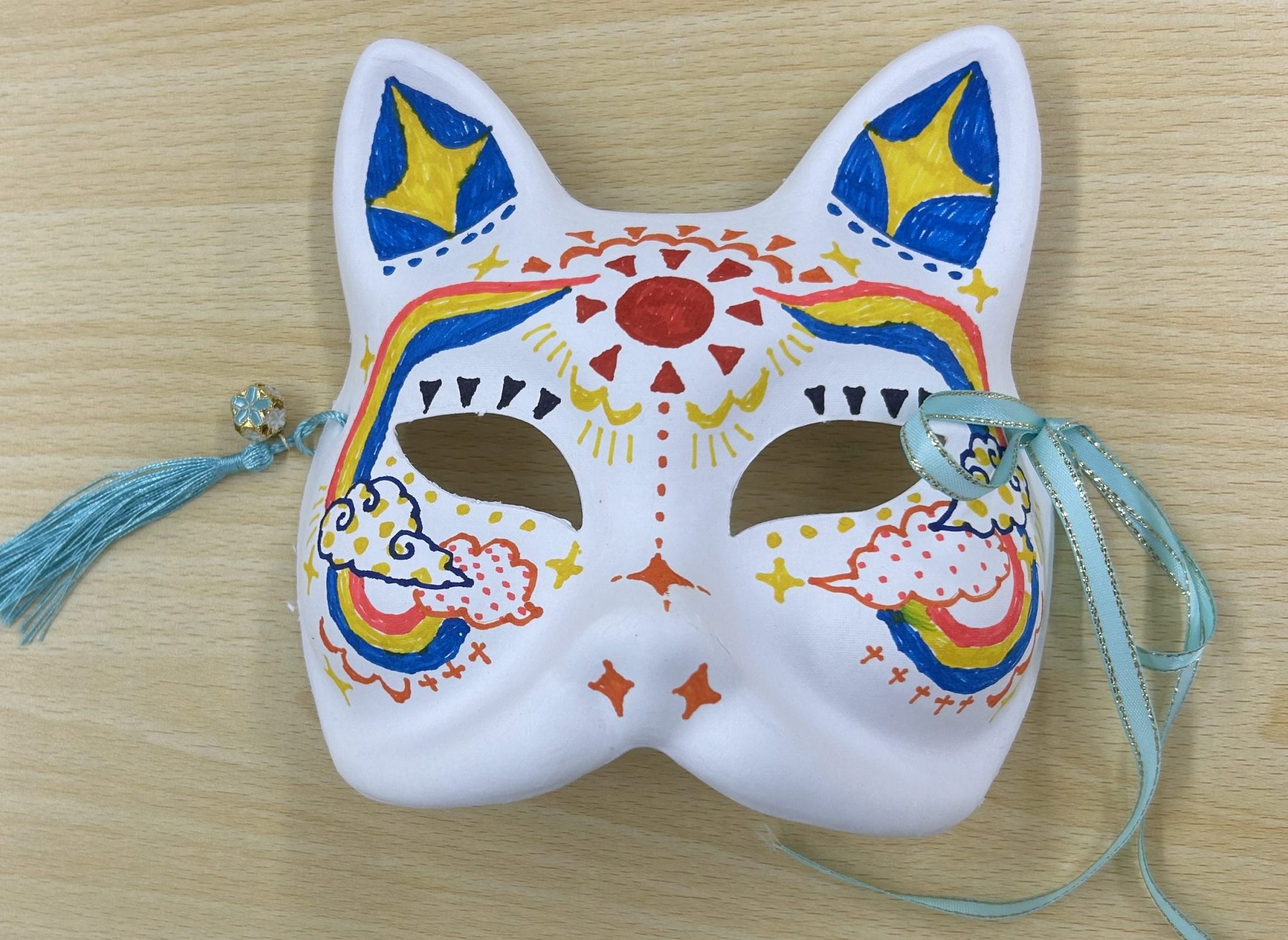 お面に各々のデザインを付け、色塗りをして頂きました🎨