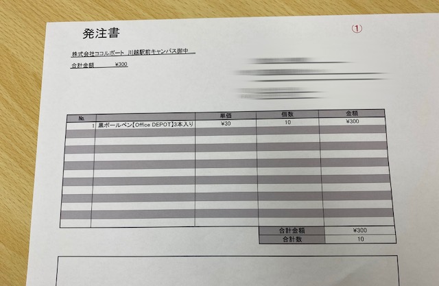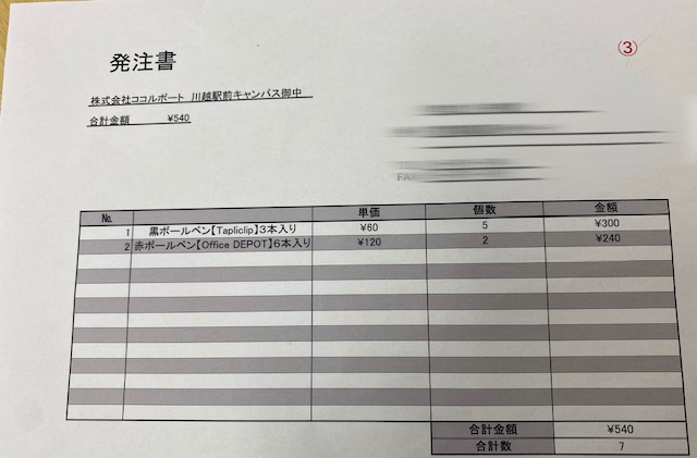 川越駅前キャンパスで、訓練用に作成した発注書があります。