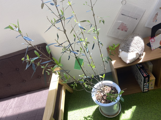 事業所にはいくつか観葉植物が置いてありますが、私のお気に入りはこのオリーブの木。