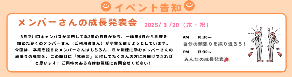 今年3月に多くのメンバーさんが卒業を迎えようとしています。そんな卒業を控えたメンバーさんはもちろん、日々訓練に励むメンバーさんの 頑張りの成果を、この節目に「発表会」と称してたくさんの方にお届けしたいと思います!