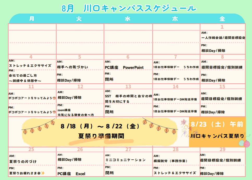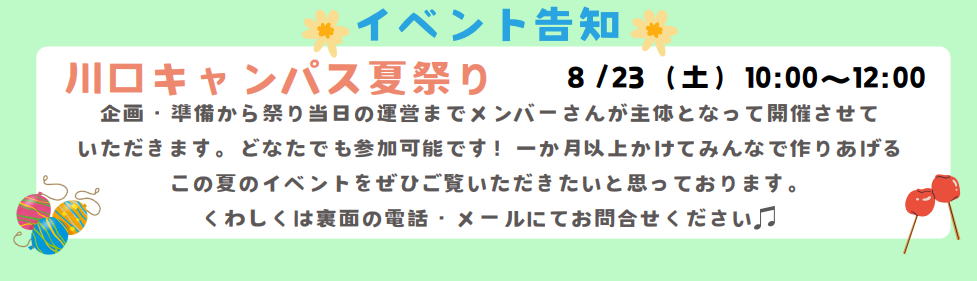 今回は8月のプログラムと23日に開催される夏祭りについてご紹介させていただきます!