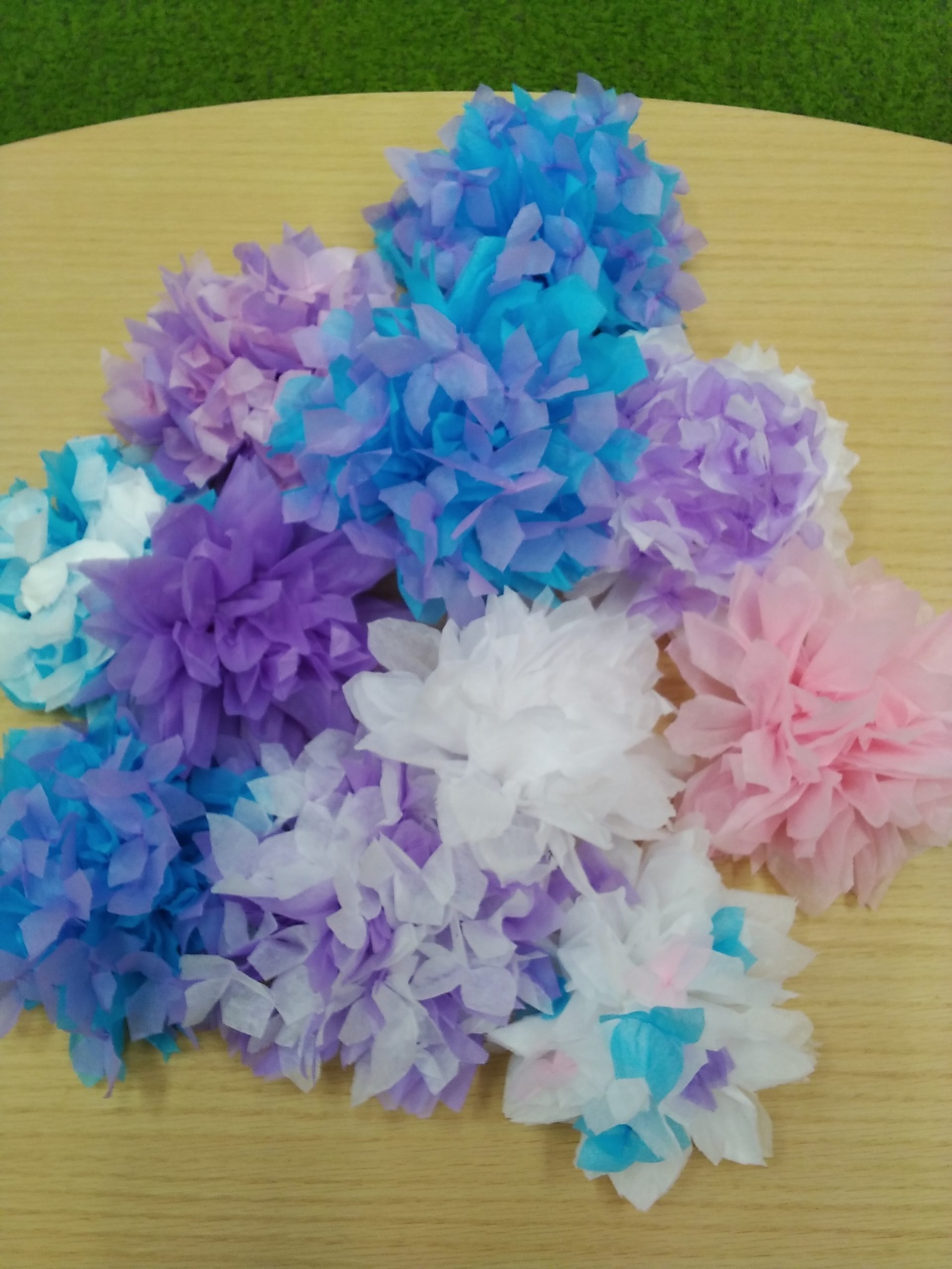 複数の色のお花紙を重ねて、接着剤で貼って、と少々工程は多いのですが、とても華やかに仕上がりました。