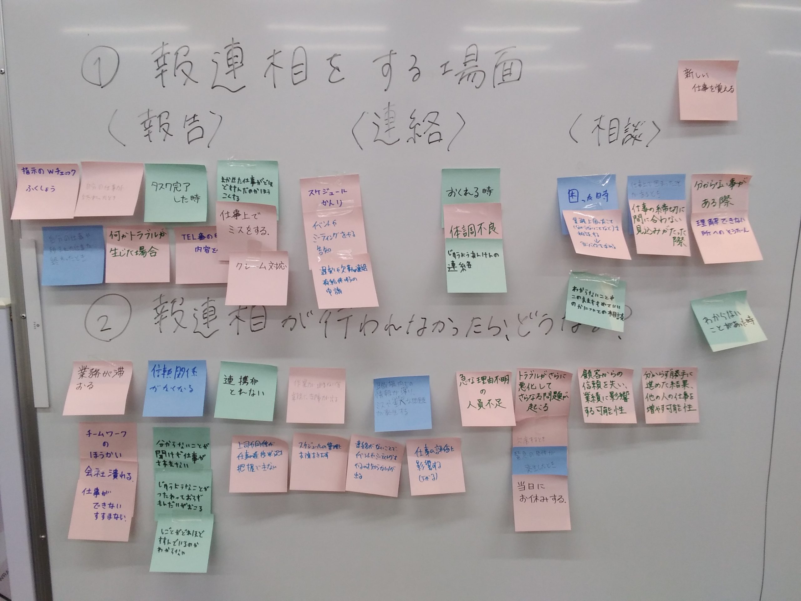 プログラムでは報連相の重要性やポイントを確認した後、皆さんに報連相が必要な状況を書き出して頂きました。
