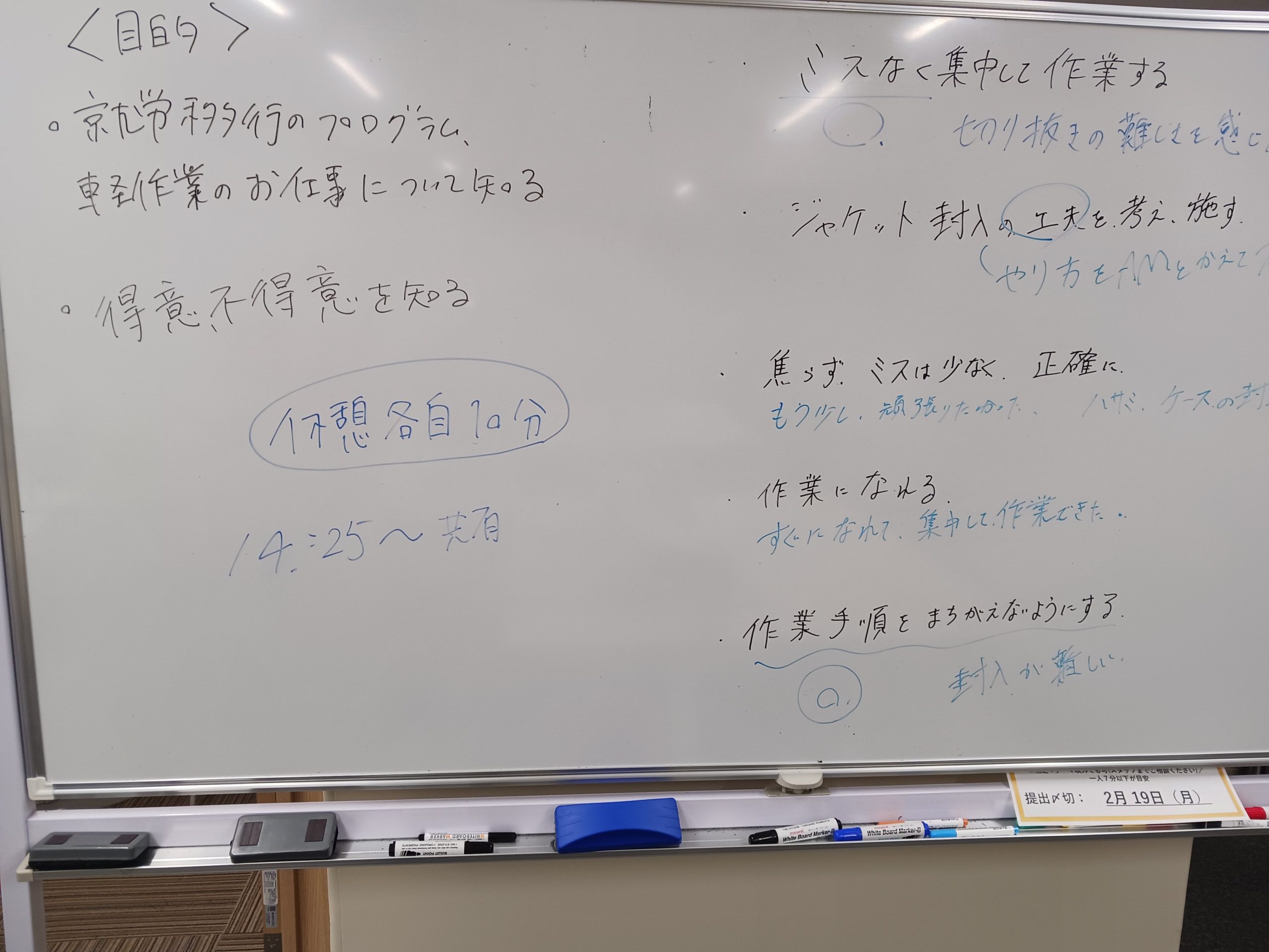 一日通して行う目的としては、同じ作業を長時間行うことでの集中力や正確性の変化を確認したり、作業への慣れや効率的に仕事を行う上で気づいた工夫点などを実感してもらうことにあります。