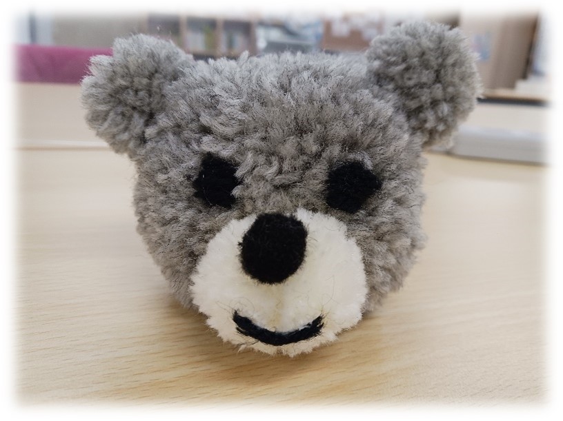 キャンパス内にあるポンポンメーカーという道具を使用して毛糸を球状に整えて作ります。目元や口元までとても丁寧に作成されていますね。