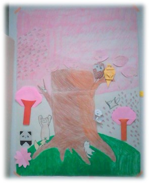 どんな構図で絵を描くか、何を描くのか等を皆で話し合いながら、みんなの力を合わせて完成させることができました。色んな動物が桜の木に集まっていて、とても可愛らしいですね。