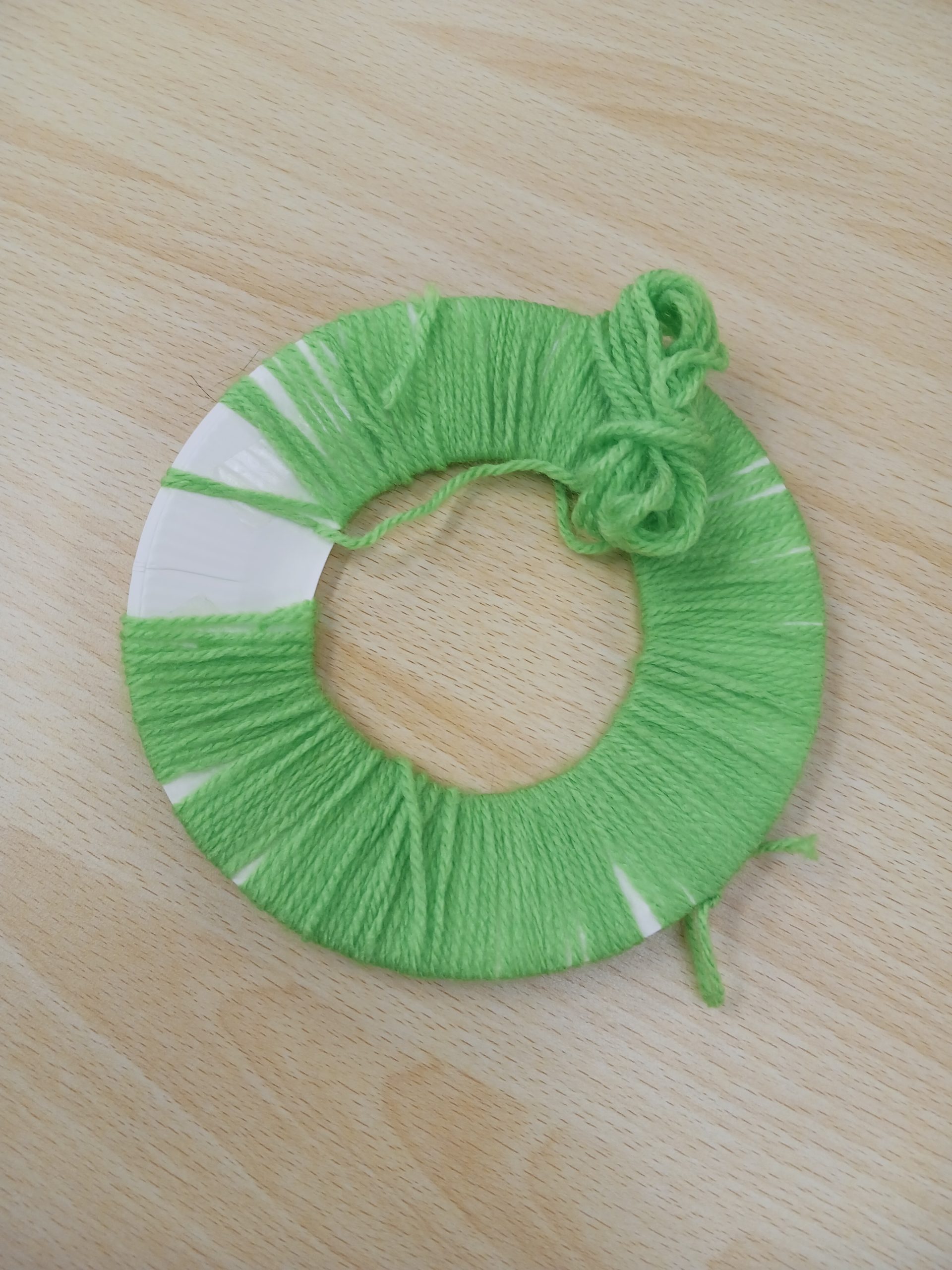 リースの作り方は紙皿の真ん中を切り抜いて、毛糸をくるくる巻き付けていきます