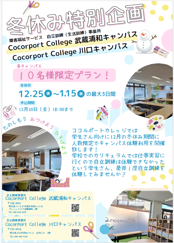 武蔵浦和キャンパスでも冬休み、クリスマスにて特別企画やパーティーを行いますのでご紹介をさせて頂きます!☃️