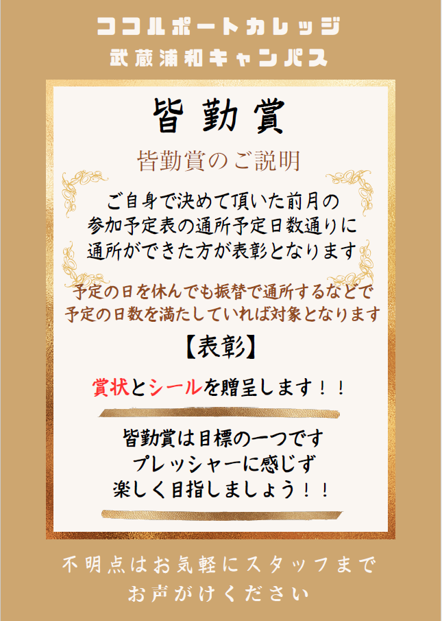 武蔵浦和キャンパスでは昨年の11月から「皆勤賞」を始めています。